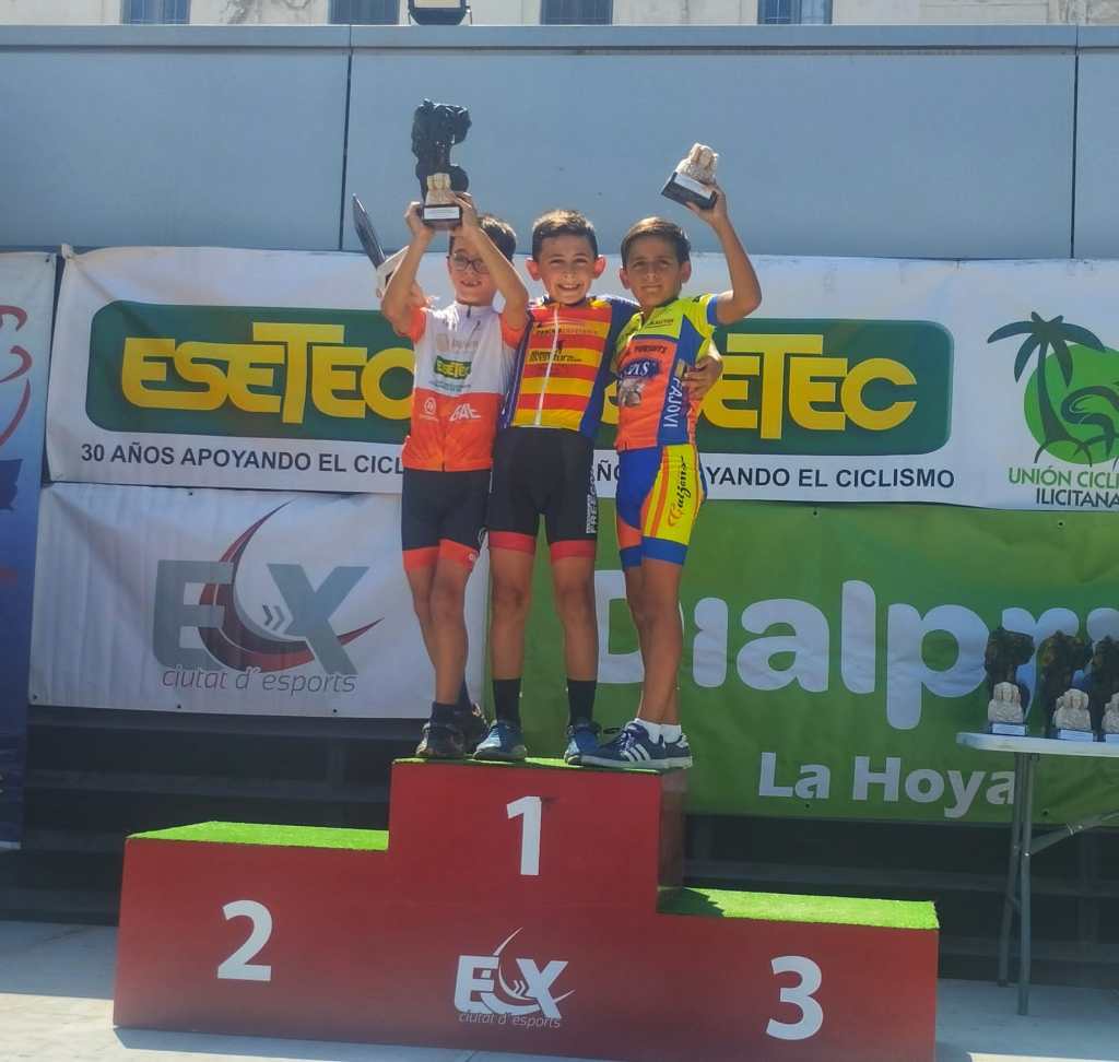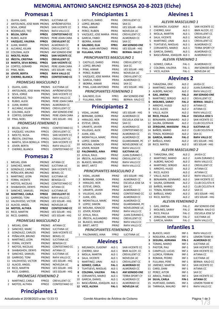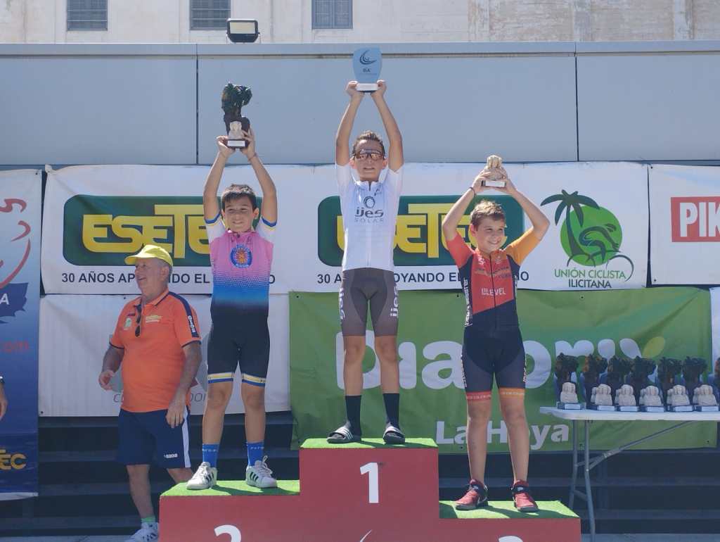 El Club Ciclista Almoradí se ha impuesto esta mañana en el XXII Trofeo Escuelas de Elche 2023-III Memorial Antonio Sánchez Espinosa. La Unión Ciclista Ilicitana ha sido segunda y el Aitana, tercero. A nivel individual, Gael Olaya (UC Ilicitana) y Sofía Belda (CC Contestá) se han impuesto en Promesas 1; Izan Mejías (Aitana) y Carla Martínez (Crevillent), en Promesas 2; Darío Castillo (Crevillent) y Elía Galindo (AM Sonido), en Principiantes 1; Jaume Vidal (Ijes Solar) y Aina Palomares (UC Ilicitana), en Principiantes 2; Eugenif Melnikov (CC San Vicente) y Carla Gómez (Almoradí), en Alevines 1; Eric Tarazona (Jávea) y Jimena Gas (AM Sonido), en Alevines 2; Iago Blasco (Rafa Valls) y Adriana Segura (Almoradí), en Infatiles 1; y Álvaro Hernández (Almoradí) y María Ivars (Bernia Xaló), en Infantiles 2.