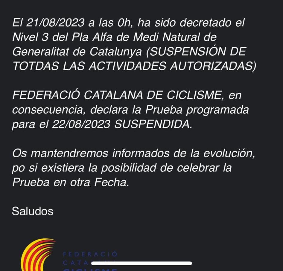 Con motivo de la activación del del Nivel 3 del Plan Alfa de vigilancia, prevención y control de actividades de riesgo frente a las situaciones de peligro de incendio forestal en la localidad de La Sénia (Montsià), se decreta la anulación de la disputa del 54º Trofeo Sant Bertomeu , prueba de Grandes Clásicas-7º Trofeo Joan Casadevall prevista para disputarse este martes 22 de agosto . Brocar-ALÉ, Esetec-Pikolinos y Ulevel Safir Fruits tenían previsto correr la prueba. Lista de inscritos.