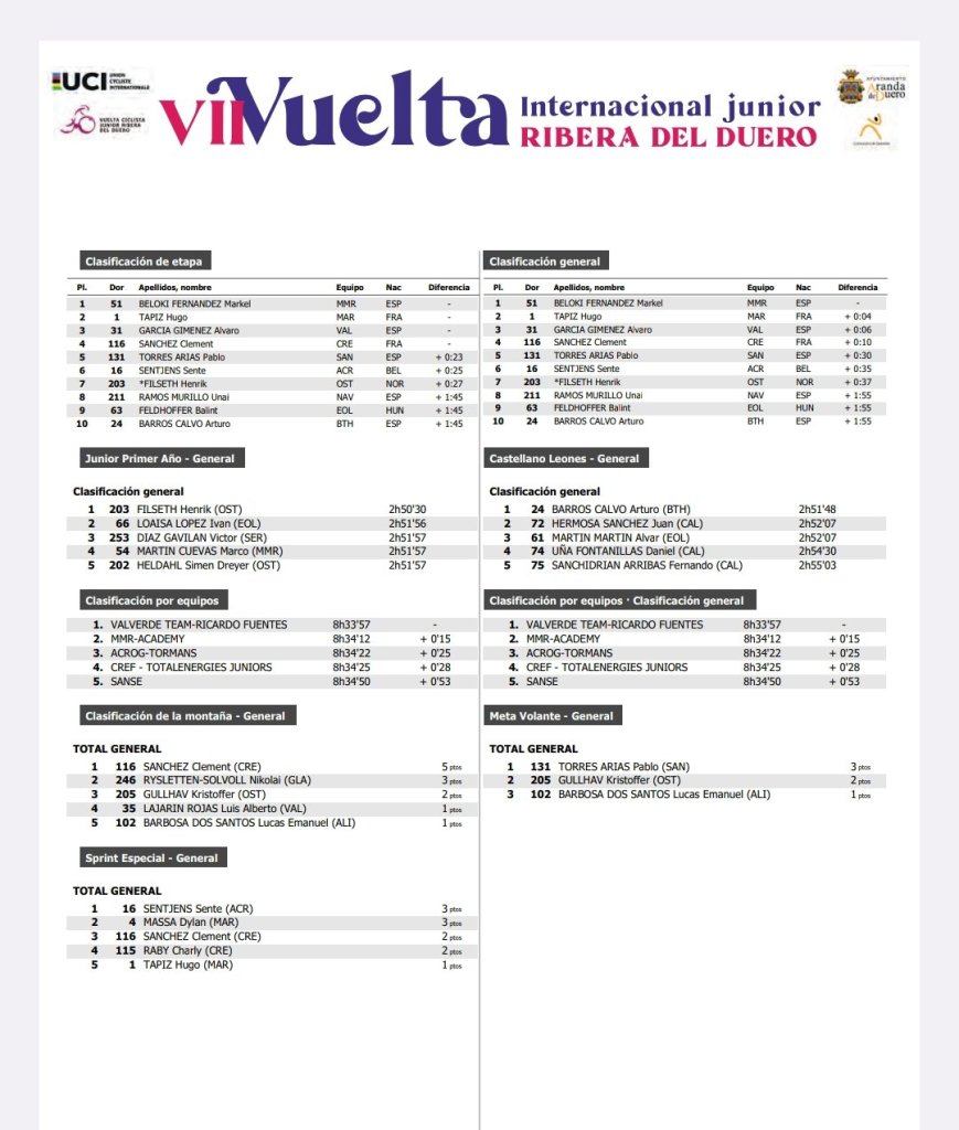 Markel Beloki (MMR) se ha impuesto en Clunia en la primera etapa de la VII Vuelta Internacional Júnior Ribera Duero con un tiempo de dos horas, 50 minutos y tres segundos. Hugo Tapiz (VC La Pomme)) ha sido segundo y Clément Sánchez (CREF), tercero. Alvaro García (Valverde Team) ha terminado cuarto.