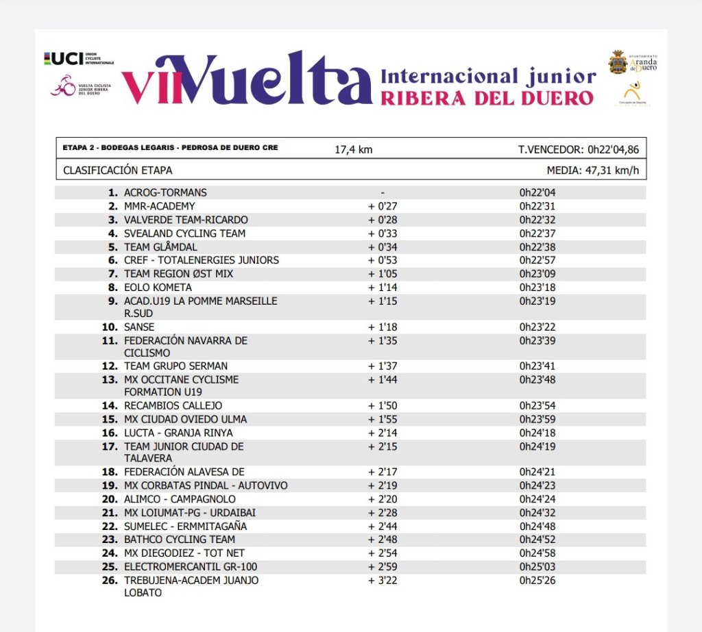 El Acrog Tormans gana la CRE de la Vuelta a la Ribera de Duero y Markel Beloki, de MMR Academy mantiene el maillot de líder a la espera del segundo sector, en línea, entre Bodegas Legaris y Pedrosa de Duero.