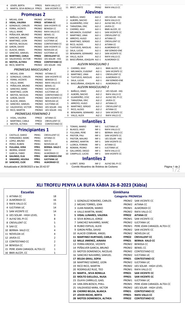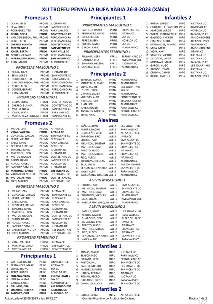 Además, Gael Olaya (UC Ilicitana) y Sofía Belda (CC Contestá) han ganado en Promesas 1; Izán Mejías (Aitana) y Valeria Vidal (Aitana), en Promesas 2; Darío Castillo (Crevillent) y Vera Fullana (Bernia Xaló), en Principiantes 1; Gorka Bernabé (Almoradí), en Principiantes 2; Xavi Cherro (CC Contestá), en Alevines 1; Ximo Bañuls (Ijes Solar), en Alevines 2; Mario Tomás (UC Ilicitana), en Infantiles 1; y Sergi Lloret (CC Alfaz del Pi), en Infantiles 2.