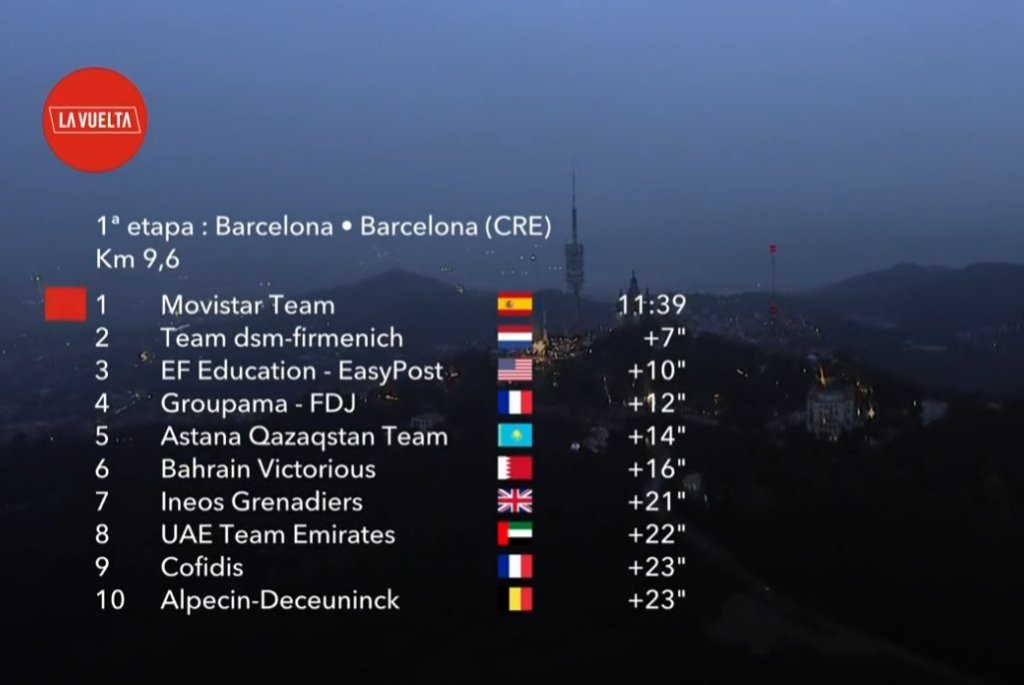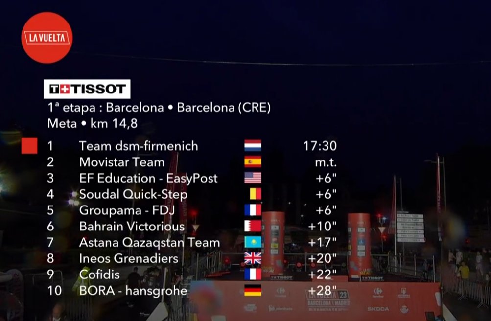 El equipo DSM-firmenich se impuso este sábado en la contrarreloj por equipos que abrió La Vuelta 2023 en Barcelona, 15 kilómetros marcados por la lluvia que complicó mucho la crono con múltiples caídas. Lorenzo Milesi se ha convertido en el primer líder de la clasificación general. Con 21 años y 160 días ha sido el segundo más joven, solo por detrás de Miguel Indurain en 1985 con 20 años y 283 días.