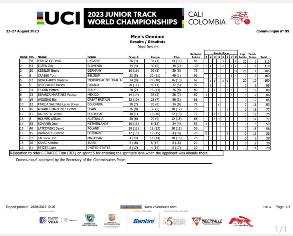 Rusia, con 4 medallas de oro, e Italia con 3, se mantienen en la parte alta del medallero del Campeonato Mundial Júnior de Ciclismo de Pista UCI Cali 2023, luego que este sábado, se cumpliera el penúltimo día del certamen con dos nuevos récords orbitales.