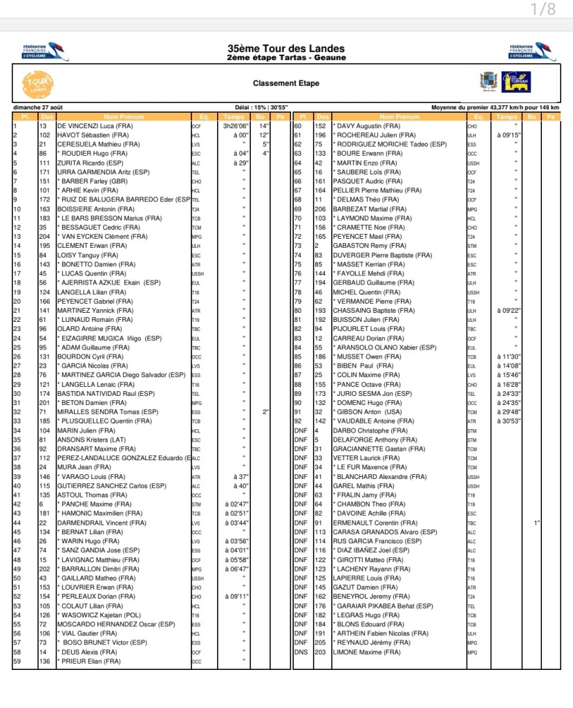 Luca De Vincenzi (OCF Team Legend) ha ganado la segunda etapa del Tour des Landes que ha partido Morcenx-la-Nouvelle y ha finalizado en Boulevard du Chemin Vert de Mont-de-Marsan. De esta manera, De Vincenzi se ha adjudicado la general. La escapada de la jornada, formada por Luca, Sébastien Habot, Mathieu Cérésuela y Hugo Roudier ha llegado a meta y ha provocado un auténtico vuelco a la General que antes de partir esta mañana encabezaba Ricardo Zurita, con Tomás Miralles séptimo y líder de la montaña. Una pena porque el Equipo Essax estaba con el deseo de luchar por todo y de tratar de llegar a Miralles al amarillo final.
