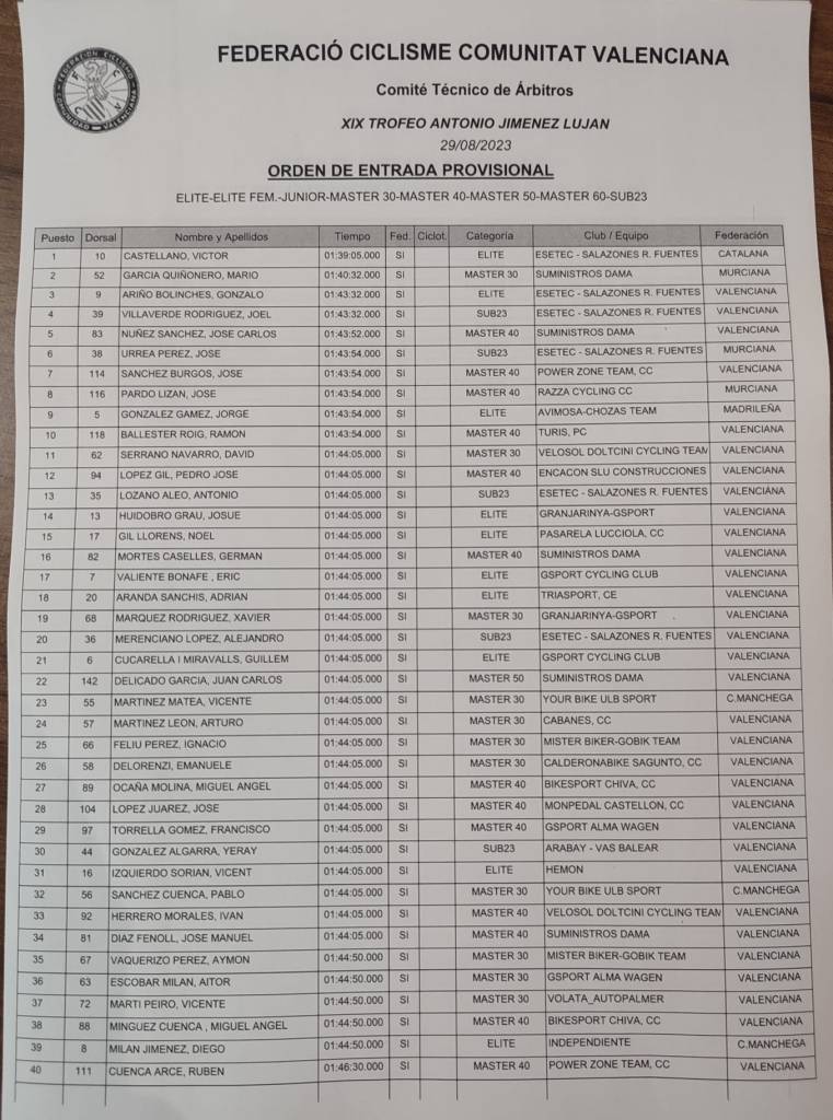 Víctor Castellano (Esetec Salazones Ricardo Fuentes) se ha impuesto en solitario esta tarde en Turís en el XIX Trofeo Antonio Jiménez Luján. Su tiempo ha sido de una hora, 39 minutos y cinco segundos. Mario García Quiñonero (Suministros Dama) ha entrado a continuación y Gonzalo Ariño (Esetec Salazones Ricardo Fuentes) ha completado el podio. Joel Villaverde (Esetec Salazones Ricardo Fuentes) ha terminado cuarto y primer Sub23.