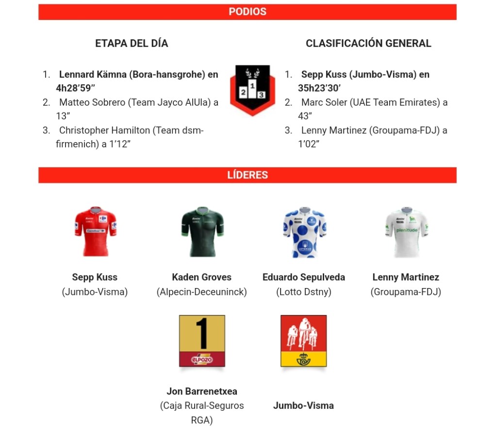 Tan solo Roglic trató de aprovechar su remate para arañar algún segundo. El esloveno se llevó 2 segundos de premios. Kuss conservó la roja con 43 segundos sobre Marc Soler y 1.03 respecto a Lenny Martínez.