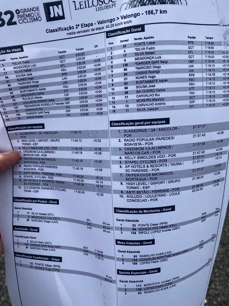 En meta, Luís Mendonça y Pedro Silva abrieron un pequeño espacio para poder triunfar, y teniendo en cuenta la ventaja, el veterano «mandó» al pupilo del Glassdrive-Q8-Anicolor a cruzar la meta en primer lugar. En su primera victoria como profesional. La bonificación de diez segundos le sitúa a la altura de César Fonte en la clasificación general, pero gracias a los puntos, el ciclista de Viana do Castelo sigue vistiendo el maillot amarillo de la carrera, al menos hasta la 3ª etapa. El experimentado ciclista, líder de la clasificación general, es también líder de montaña y combinada. En juveniles, el líder es el ganador de la etapa, Pedro Silva, en las dianas volantes está André Ramalho y en los sprints especiales está Jonatan Montoya (Portos Windmob). El equipo general ahora está liderado por Glassdrive-Q8-Anicolor.
