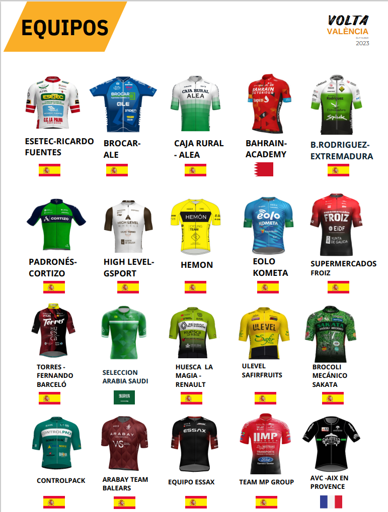 Tres equipos gallegos: el High Level Gsport, el Supermercados Froiz y el Padronés Cortizo estarán en esta Volta a Valencia mientras que la representación madrileña llega con el EOLO KOMETA de la Fundación Alberto Contador. Desde Extremadura, llega el conjunto Bicicletas Rodríguez y resta el conjunto navarro Caja Rural ALEA, que sin duda parte como uno de los grandes bloques de la prueba.