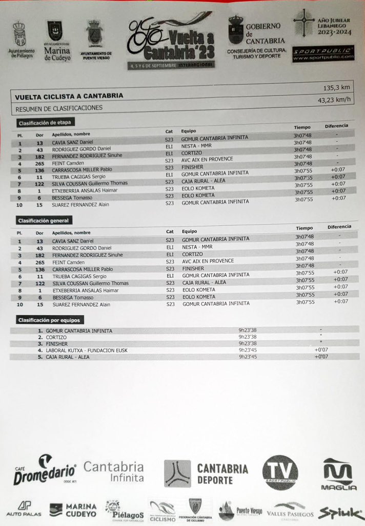 Daniel Caviá (Equipo Gomur) se ha impuesto en la primera etapa de la Vuelta a Cantabria y se ha vestido de líder de la Vuelta a Cantabria 2023. Superó a sus compañeros de ofensiva Rodríguez (Nesta) y Fernández (Padronés Cortizo) con el pelotón a pocos segundos pero sin lograr neutralizarles en el último kilómetro.