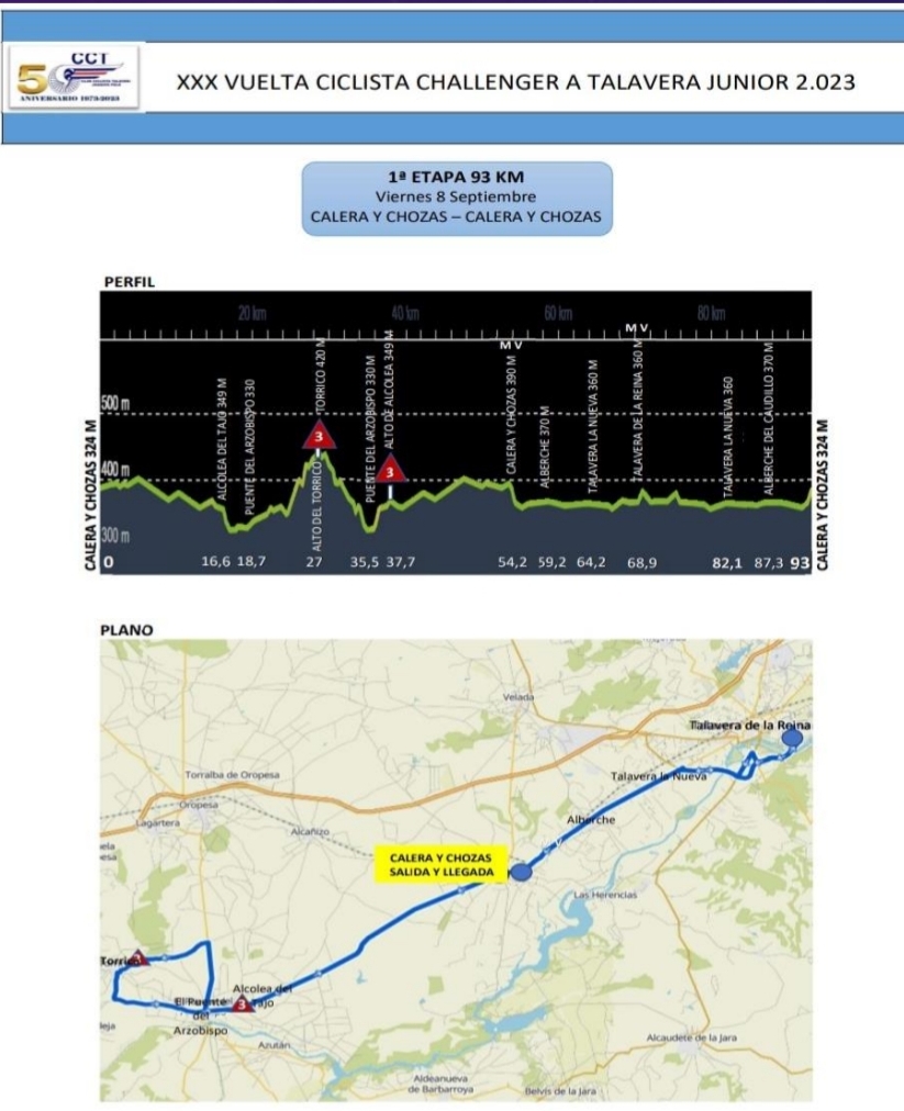La Vuelta a Talavera arrancará el viernes 8 de septiembre, a partir de las 16:55 horas, en una primera etapa con salida y llegada en la localidad de Calera y Chozas. Una etapa llana de 93 km. con dos pequeños puntos montañosos de 3ª categoría en los Altos del Torrico y Alcolea. La Meta Volante estará ubicada en Calera y Chozas.