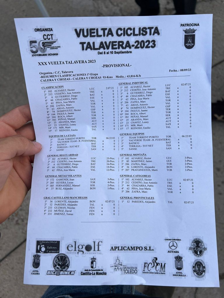Héctor Álvarez (Lucta-Granja Rinya) se ha impuesto al esprint en la primera etapa de la Vuelta Ciclista a Talavera 2023 que ha tenido salida y meta en Calera y Chozas tras 93 kilómetros de recorrido. Su tiempo ha sido de dos horas, siete minutos y 21 segundos. José Antonio Cedeño (Trebujena) ha sido segundo y Diego Gutiérrez (Bathco), tercero. Cuarta plaza para Pablo Chazarra (Esetec). Álvarez domina la Regularidad y Montaña, mientras que Joan Gamundi (Saxun Extrusax Primoti) se ha vestido con el maillot de las metas volantes.