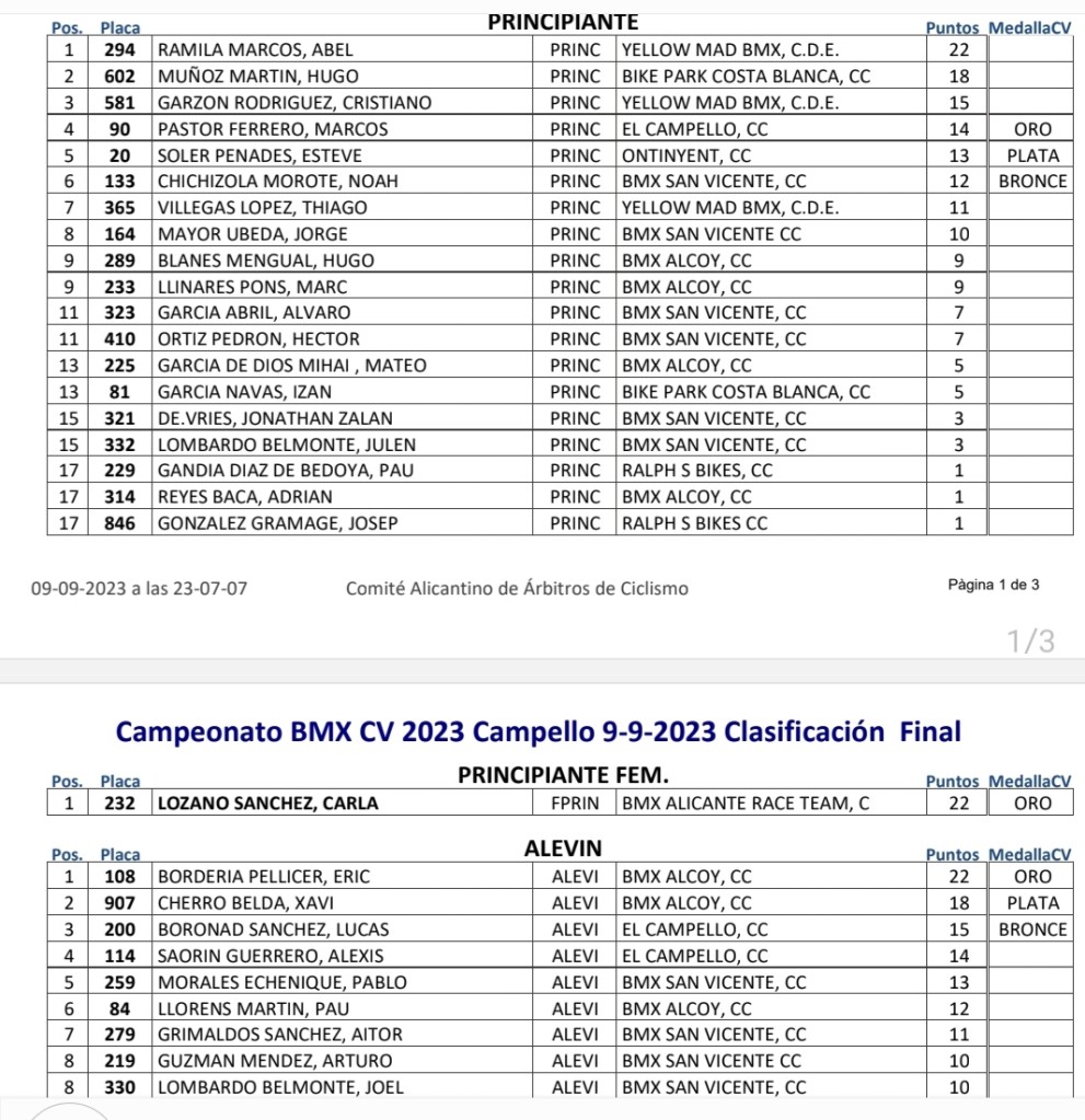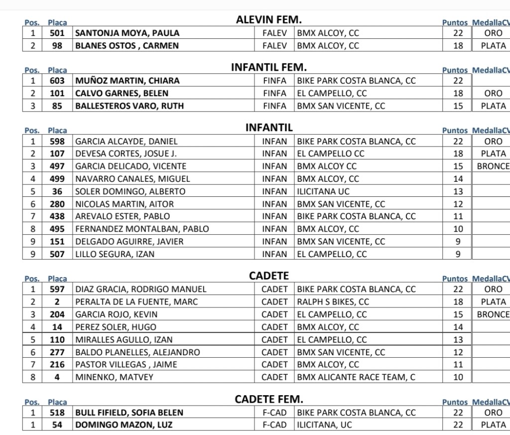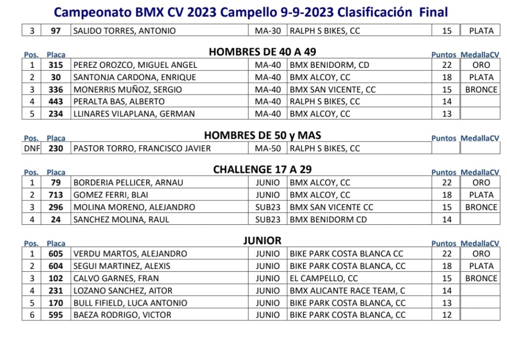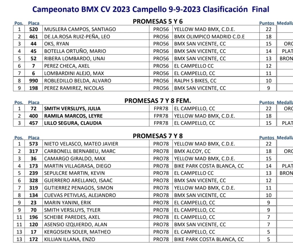El Polideportivo El Vincle de El Campello vistió el sábado a los nuevos campeones autonómicos de BMX. Ryan Oks (BMX San Vicente) se impuso en la categoría Promesas 5 y 6; Julia Smith (El Campello) y Marc Carbonell (BMX Alcoy), en Promesas 7 y 8; Marcos Pastor (El Campello) y Carla Lozano (BMX Alicante), en Principiantes; Eric Bordería (BMX Alcoy) y Paula Santonja (BMX Alcoy), en Alevines; Belén Calvo (El Campello) y Daniel García (Bike Park Costa Blanca), en Infantiles; Rodrigo Manuel Díaz (Bike Park Costa Blanca) y Sofía Belén Bull (Bike Park Costa Blanca), en Cadetes; Raúl Saorín (El Campello), en Hombres 30 a 39; Miguel Ángel Pérez (Benidorm BMX), en Hombres 40 a 49; Arnau Bordería (BMX Alcoy), en Challenge 17 a 29; y Alejandro Verdú (Bike Park Costa Blanca), en júniors.