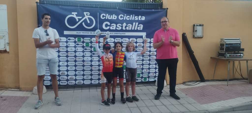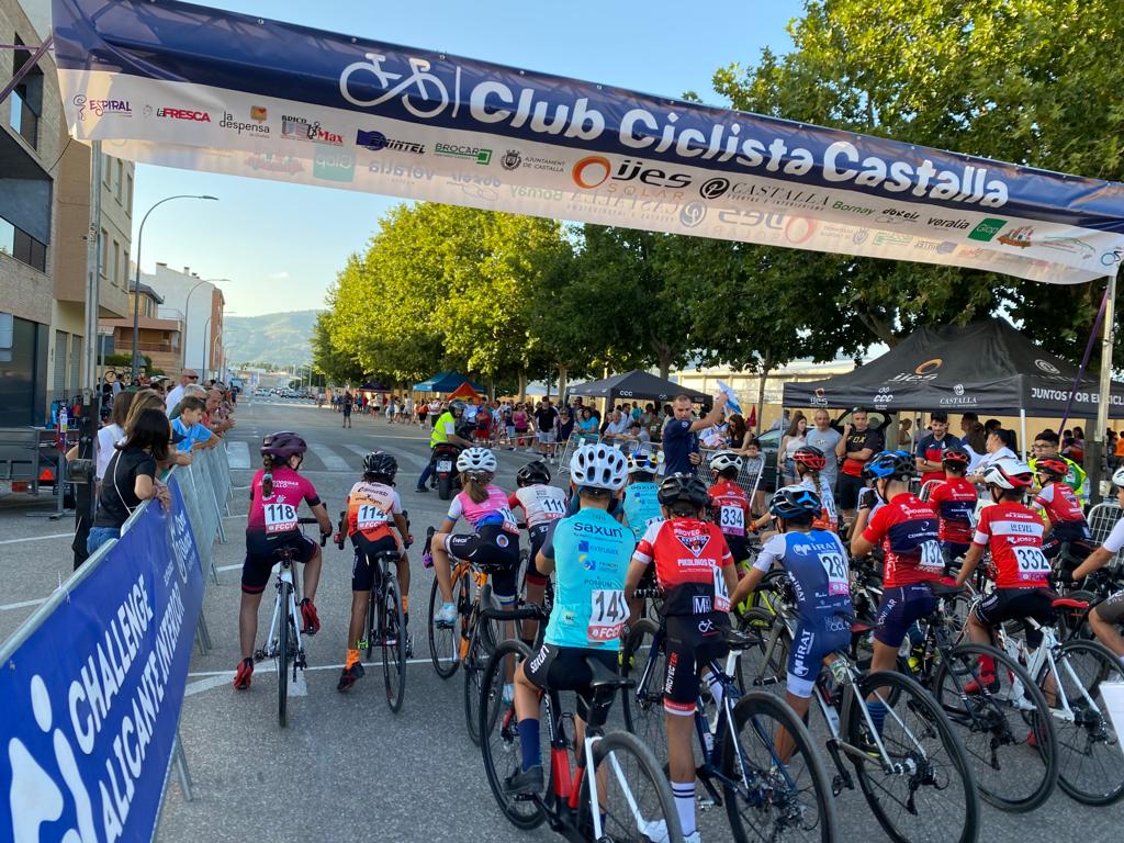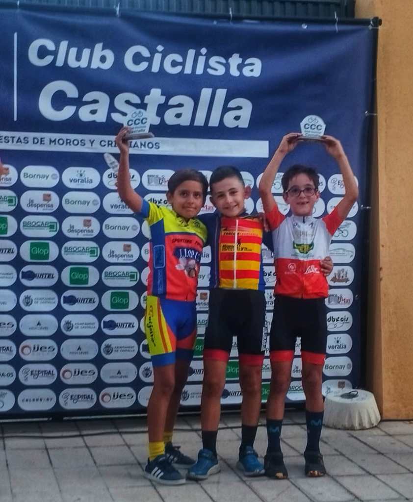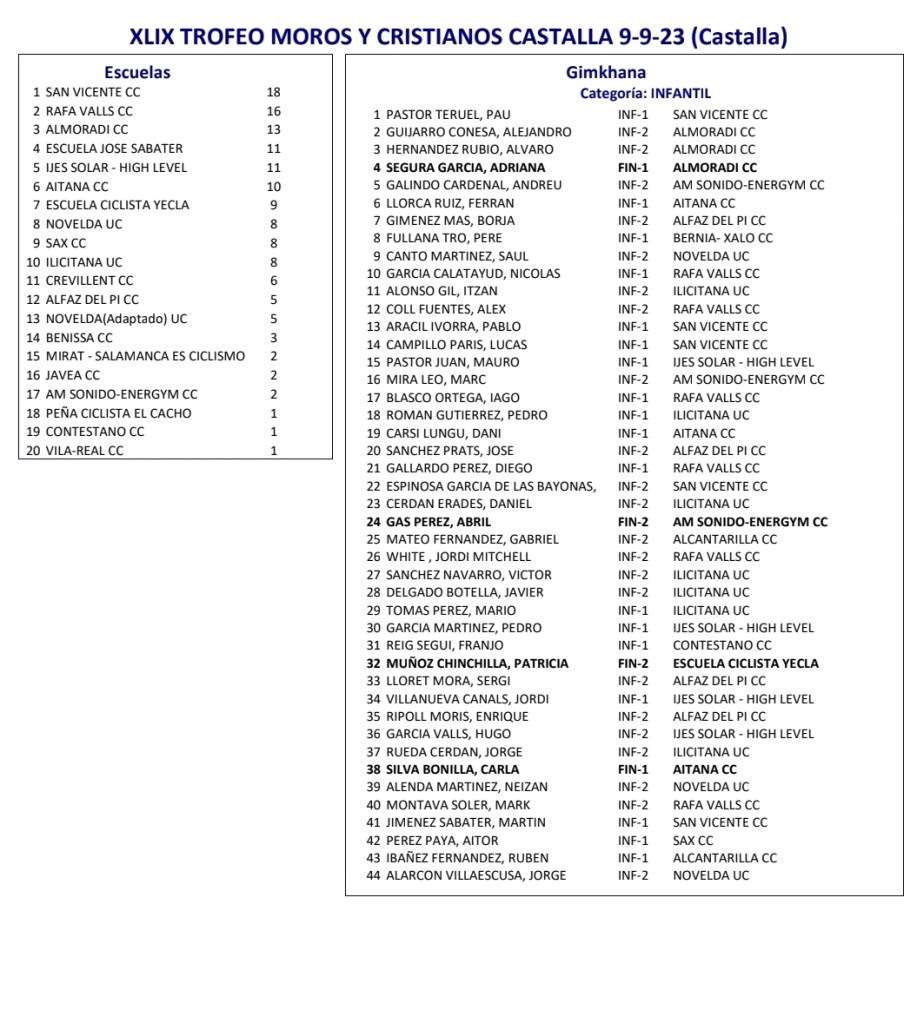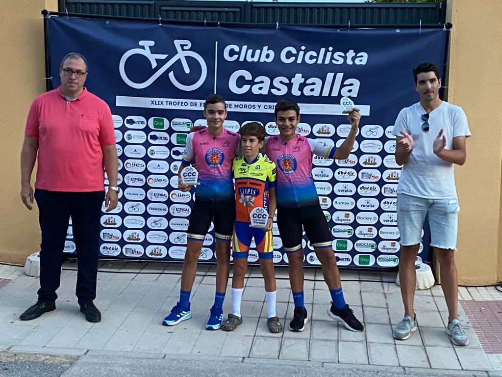 El Club Ciclista San Vicente se impuso ayer en el XLIX Trofeu Festes de Moros y Cristians de Castalla para Escuelas de Ciclismo de la Provincia de Alicante. El Club Ciclista Rafa Valls fue segundo y el CC Almoradí, tercero. A nivel individual, Gael Olaya (UC Ilicitana) y Sofía Belda (CC Contestá) se impusieron en Promesas 1, en la penúltima prueba de la Challenge. Izan Mejías (Aitana) y Valeria Vidal (Aitana), en Promesas 2; Bruno López (CC Sax) y Vera Fullana (Bernia Xaló), en Principiantes 1; Manuel Muñoz (Escuela José Sabater) y Claudia Villar (Escuela José Sabater), en Principiantes 2; Vicente Sala (Novelda) y Valeria Coloma (AM Sonido), en Alevines 1; Gonzalo Muñoz (Escuela José Sabater) y Paula Rico (Escuela José Sabater), en Alevines 2; Nicolás García (CC Rafa Valls) y Adriana Segura (CC Almoradí), en Infantiles 1; Borja Jiménez (Alfaz del Pi) y Patricia Muños (Escuela José Sabater), en Infantiles 2; y Adrián Payá (Novelda), en Adaptado, MT2.