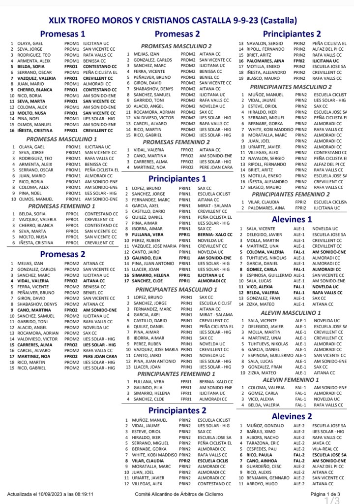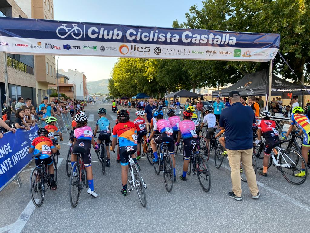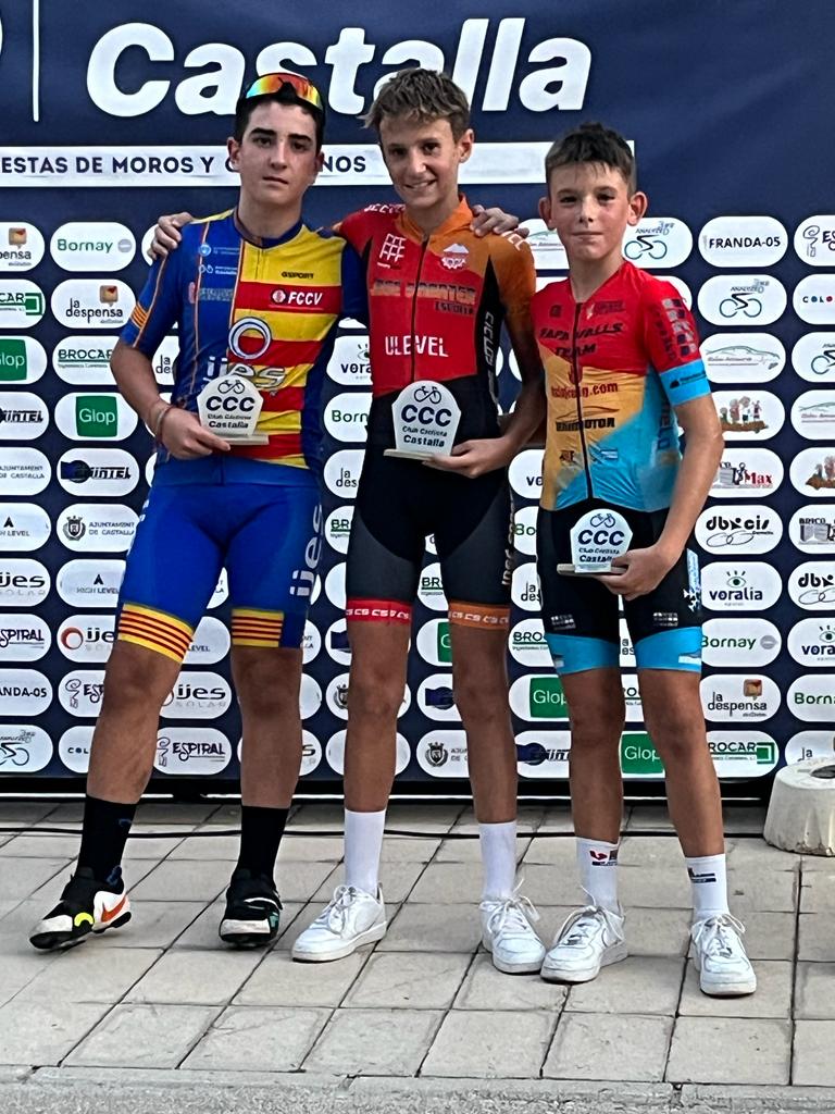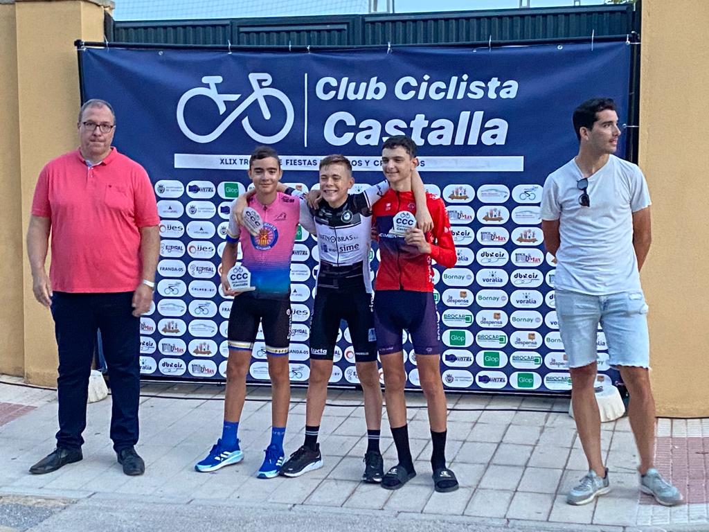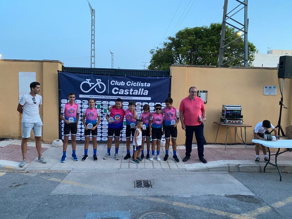 El Club Ciclista San Vicente se impuso ayer en el XLIX Trofeu Festes de Moros y Cristians de Castalla para Escuelas de Ciclismo de la Provincia de Alicante. El Club Ciclista Rafa Valls fue segundo y el CC Almoradí, tercero. A nivel individual, Gael Olaya (UC Ilicitana) y Sofía Belda (CC Contestá) se impusieron en Promesas 1, en la penúltima prueba de la Challenge. Izan Mejías (Aitana) y Valeria Vidal (Aitana), en Promesas 2; Bruno López (CC Sax) y Vera Fullana (Bernia Xaló), en Principiantes 1; Manuel Muñoz (Escuela José Sabater) y Claudia Villar (Escuela José Sabater), en Principiantes 2; Vicente Sala (Novelda) y Valeria Coloma (AM Sonido), en Alevines 1; Gonzalo Muñoz (Escuela José Sabater) y Paula Rico (Escuela José Sabater), en Alevines 2; Nicolás García (CC Rafa Valls) y Adriana Segura (CC Almoradí), en Infantiles 1; Borja Jiménez (Alfaz del Pi) y Patricia Muños (Escuela José Sabater), en Infantiles 2; y Adrián Payá (Novelda), en Adaptado, MT2.