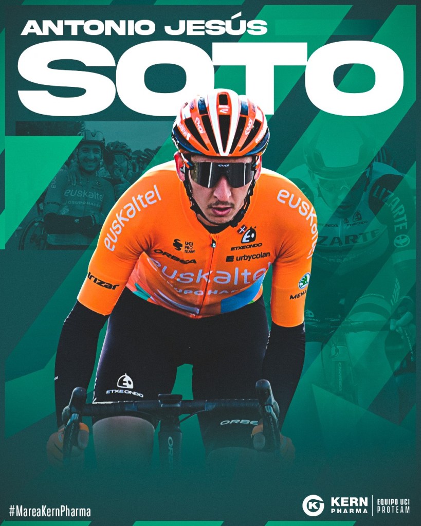 El Equipo Kern Pharma anuncia su sexto fichaje para la temporada 2024: Antonio Soto. Un ciclista con mucha experiencia en el profesionalismo que, después de cinco temporadas en el Euskaltel-Euskadi, recala en el conjunto farmacéutico con ambiciosas metas y la ilusión de volver a formar parte de la familia a la que perteneció en 2017 y 2018. Antonio Soto (Murcia, 1994) vuelve a cruzar su camino con el de la Asociación Deportiva Galibier, esta vez en su escuadra profesional, el Equipo Kern Pharma, donde militará hasta 2025. El ciclista de 28 años estrenó su palmarés en 2021 con una emocionante victoria en la Vuelta Ciclista a la Región de Murcia y destaca por su tesón, valentía y punta de velocidad. Es buen conocedor de la filosofía que en la estructura impera, pues se formó en el Equipo Lizarte, y espera dar lo mejor de sí en los próximos dos años que defenderá el verde farmacéutico. “Regresar a este proyecto me motiva mucho no solo por las condiciones, sino porque conozco a los corredores y técnicos desde hace muchos años y les tengo mucho afecto porque el Equipo Lizarte fue clave para pasar a profesionales”, reconoce Antonio Soto.