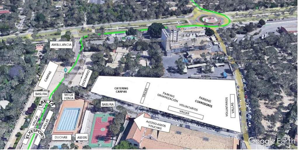 La salida será a las 9:00 en el Paseo de La Estación de Elche, donde estará también el escenario, cátering, carpas, puntos de contendores de basura, además de aseos y duchas en el Parque Deportivo, situado en la zona de meta del Paseo de la Estación. El acceso se realizará por la puerta que hay enfrente del Parking Candalix