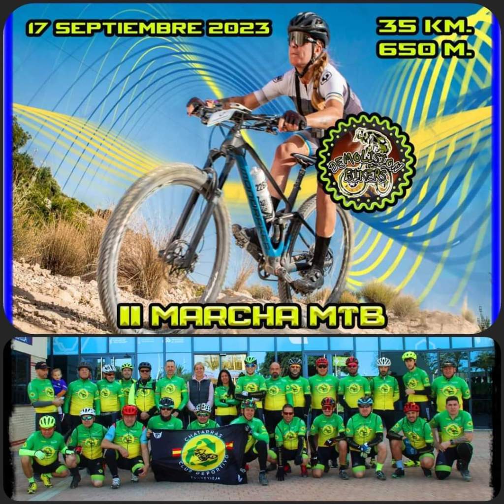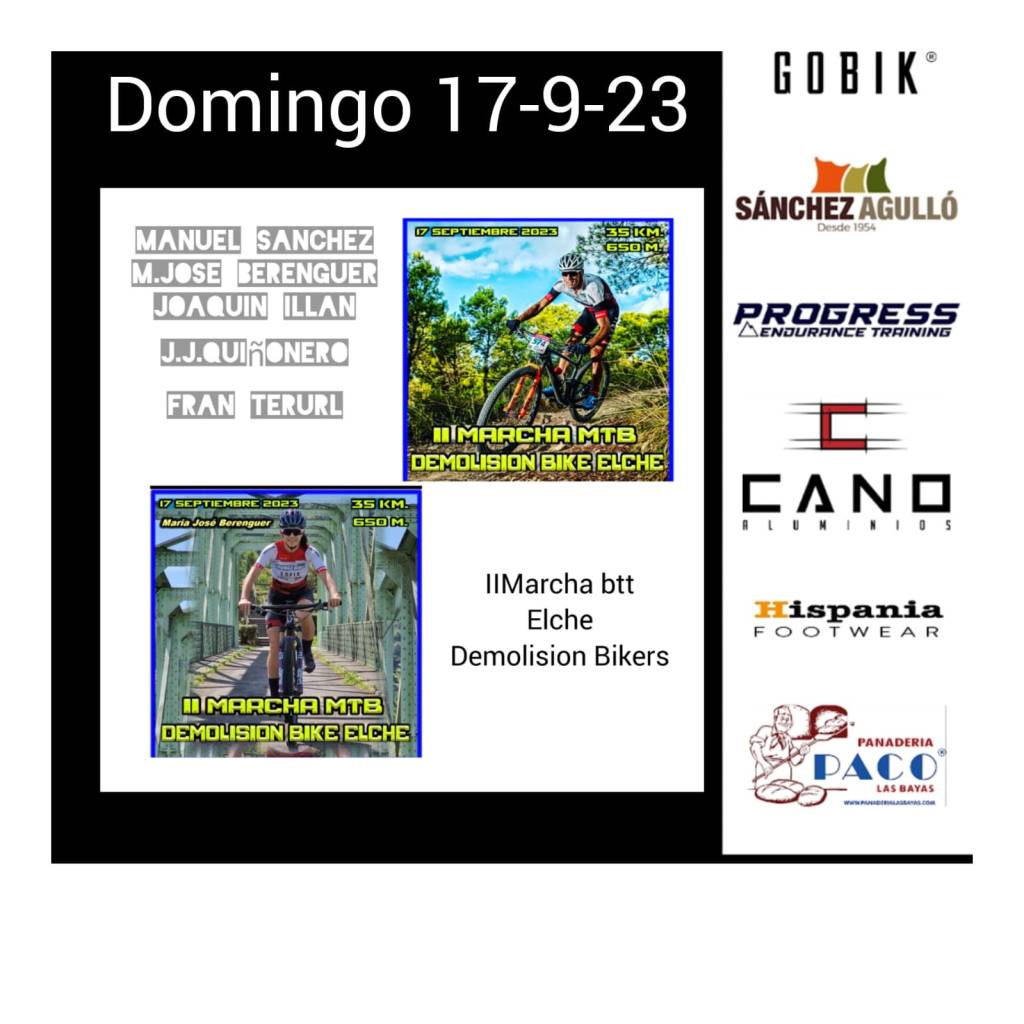 Hoy, día 17 de septiembre de 2023, se disputa la II Marcha MTB Demolision Bike Elche organizada por el Club Ciclista Demolision Bikers. Las inscripciones se cerraron el jueves a última hora para afrontar esta prueba en bicicleta de montaña no competitiva de 35 kilómetros con un desnivel positivo de 650 metros que se desarrollará por distintos parajes de la ciudad ilicitana. Los embajadores serán tres experimentados bikers como Ariadna Ródenas, Manuel Sánchez Aldeguer y María José Berenguer.