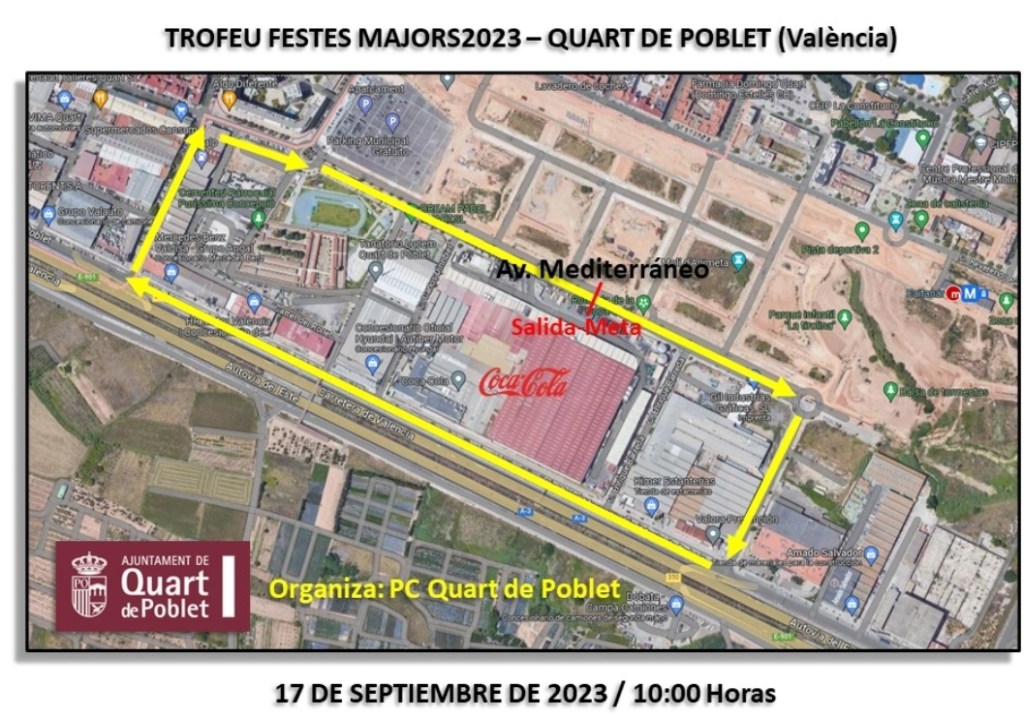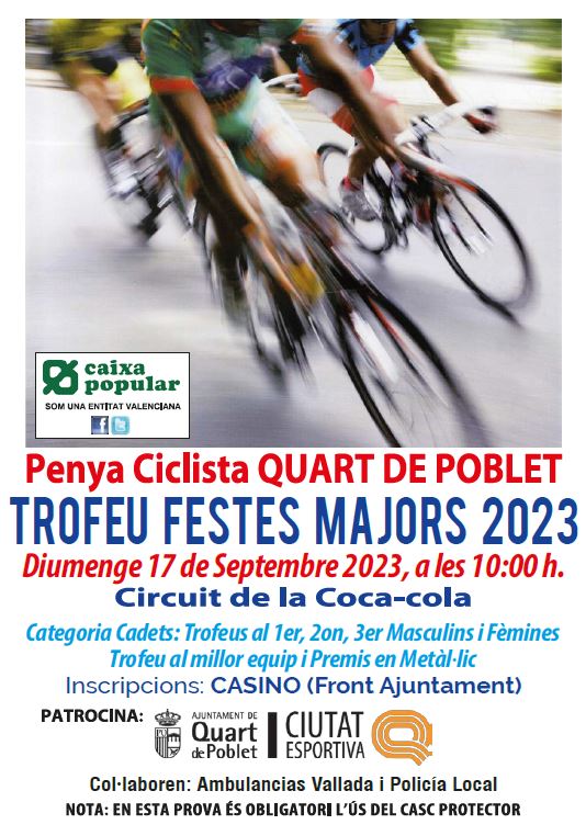 El domingo, 17 de septiembre, el pelotón cadete tiene una cita en el Trofeu Festes Majors 2023 de Quart de Poblet. En el denominado Circuit de la Coca Cola se darán 25 vueltas a un trazado hasta completar los 50 kilómetros diseñados por la Penya Ciclista Quart de Poblet, organizadora de la competición. La salida se dará a las 10 horas.