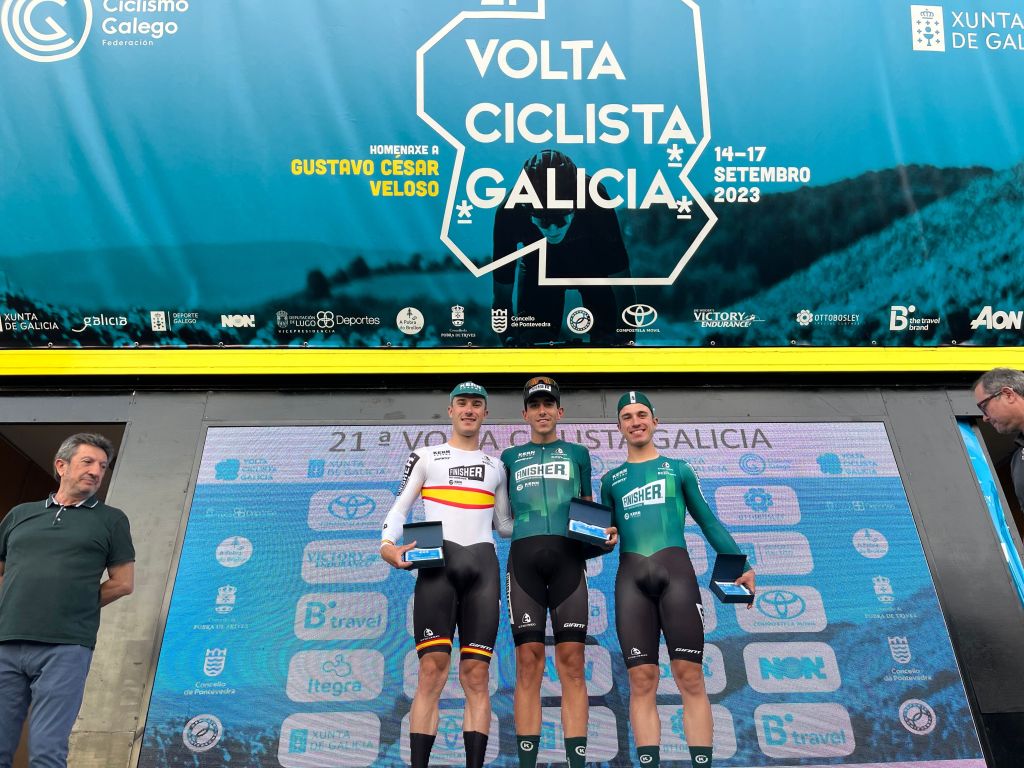 Triplete del Finisher en la etapa prólogo de la Volta a Galicia. Diego Uriarte ha sido el ganador por delante de los hermanos Aznar, Unai y Hugo, respectivamente. El conjunto navarro se impuso con autoridad el jueves en el prólogo inaugural de la Volta a Galicia (Galicia, 14-17/09), celebrado en Pobra do Brollón y colocó a tres de sus hombres en el podio: Diego Uriarte, vencedor de la etapa, Unai Aznar, segundo clasificado, y Hugo Aznar, tercero. Además, Uriarte se alzó como primer portador del maillot de líder y da al filial del Equipo Kern Pharma la vigésima victoria de la temporada.