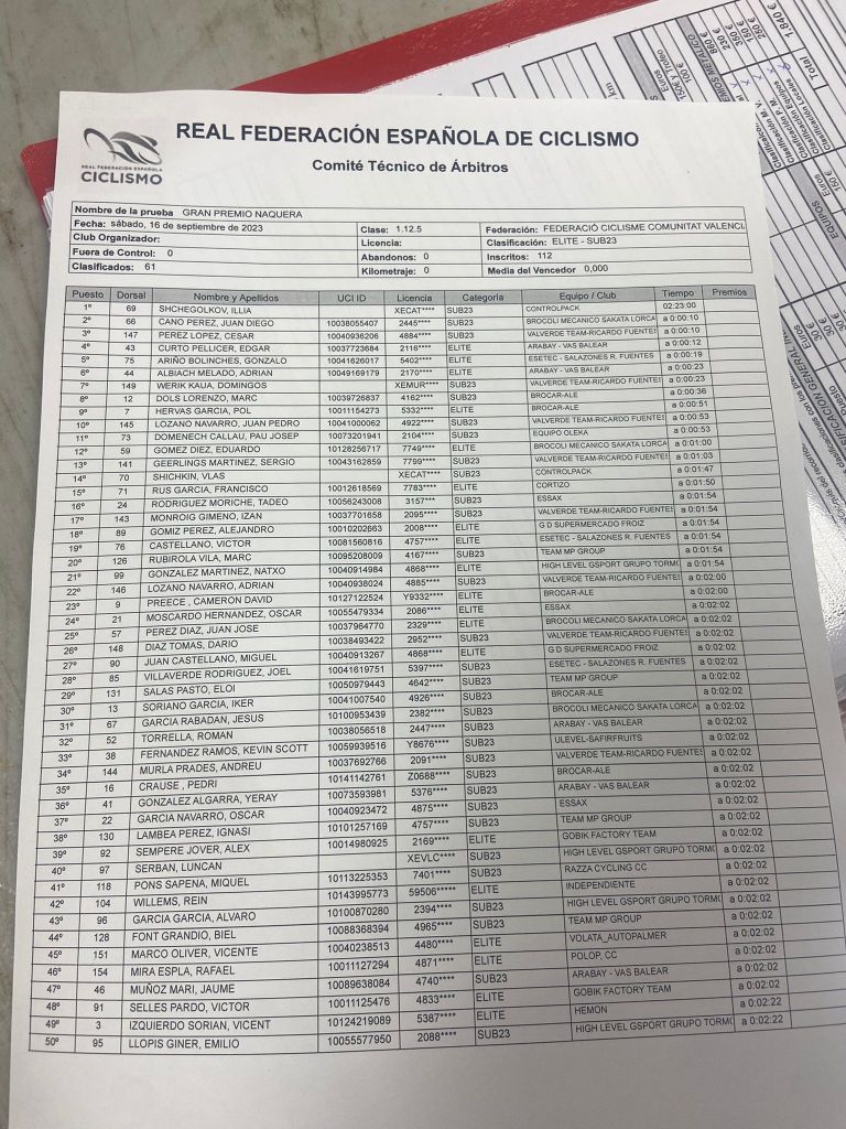 Ilia Shchegolkov (Controlpack) se ha impuesto en solitario en el Gran Premio Náquera para corredores élites y sub 23, prueba de la Challenge de la Comunidad Valenciana. Juan Diego Cano (Brócoli) ha sido segundo y César Pérez (Valverde), tercero. Adrián Albiach (Arabay) ha terminado sexto y los corredores de Brocar Alé, Marc Dolçs y Pol Hervás, octavo y noveno. Por escuadras se ha impuesto el Valverde Team.