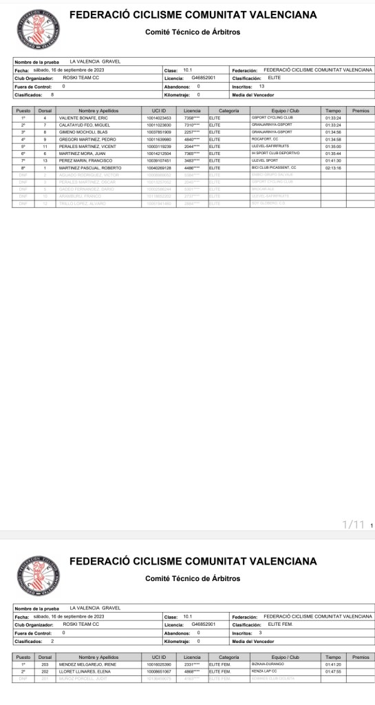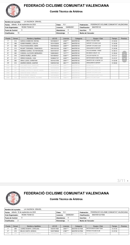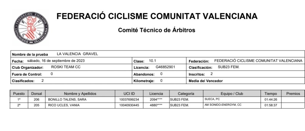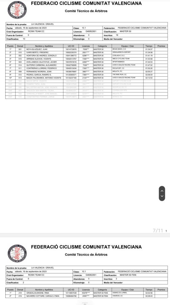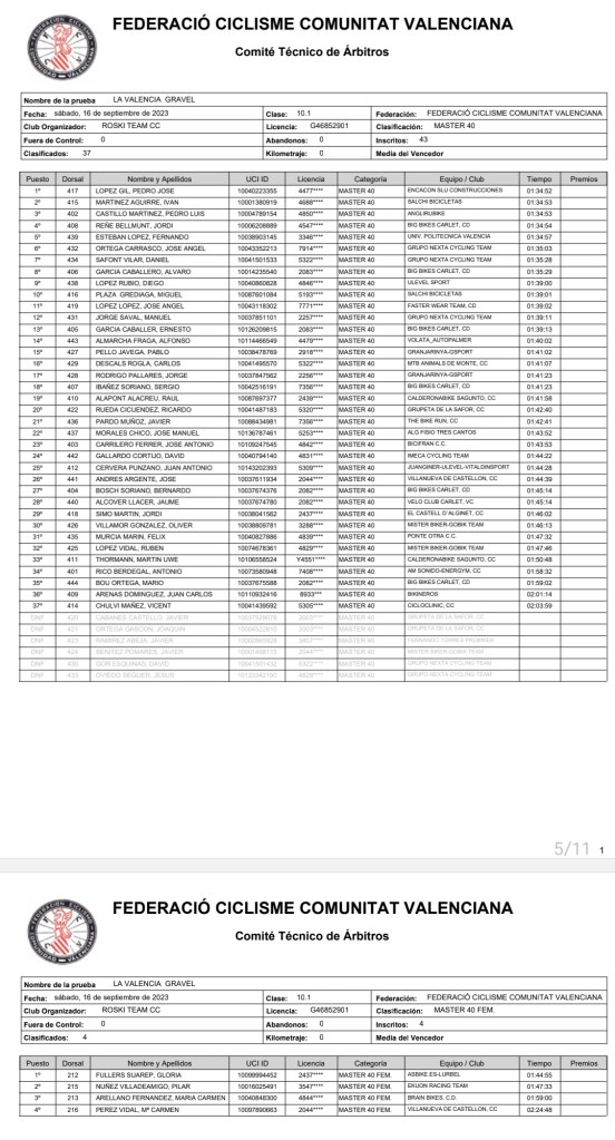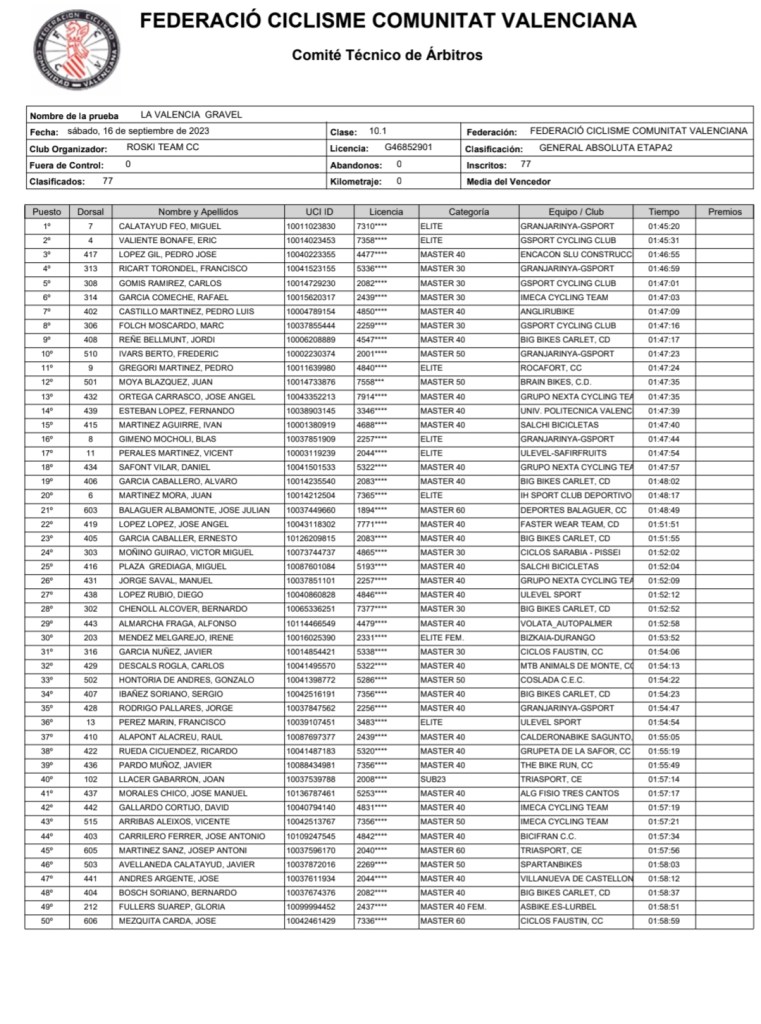 Eric Valiente (Gsport) e Irene Méndez (Bizkaia Durango) se ha impuesto en la segunda etapa de La Valencia Gravel disputada en línea por la tarde en Benifaió. Destacar que el primero en atravesar la línea de meta ha sido el júnior Jordi Fournies (Stefano Garzelli), que participaba en La Valencia Gravel Adventure. En la segunda etapa también se han impuesto Rafael García Comeche (Imeca) y Carolina Juárez (Mister Biker), en M30; Pedro José López (Encacon) y Gloria Fullers (Asbike), en M40; Juan Moya (Brain Bikes) y Rima Gramaliauskiene (Asbike), en M50; José Julián Balaguer (Deportes Balaguer), en M60;y Joan Llacer (Triasport) y Sara Bonillo, en Sub 23.