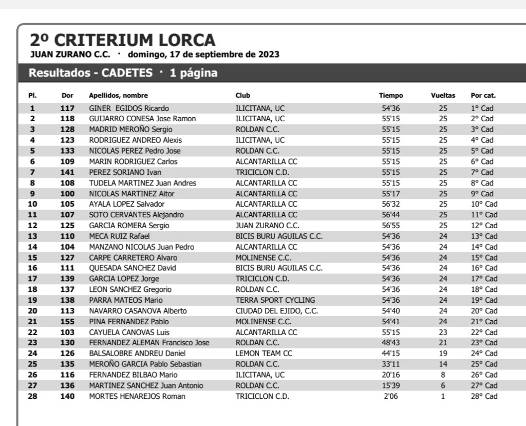 Ricardo Giner (Esetec Pikolinos) ha sido el ganador del II Critérium Ciudad de Lorca de la categoría cadete. El vencedor, que ha entrado en solitario en meta, ha estado acompañado en el podio por su compañero José Ramón Guijarro, que ha conquistado la Copa Murcia de la categoría, y de Sergio Madrid (CC Roldán). Giner se ha impuesto también en las Metas Volantes.