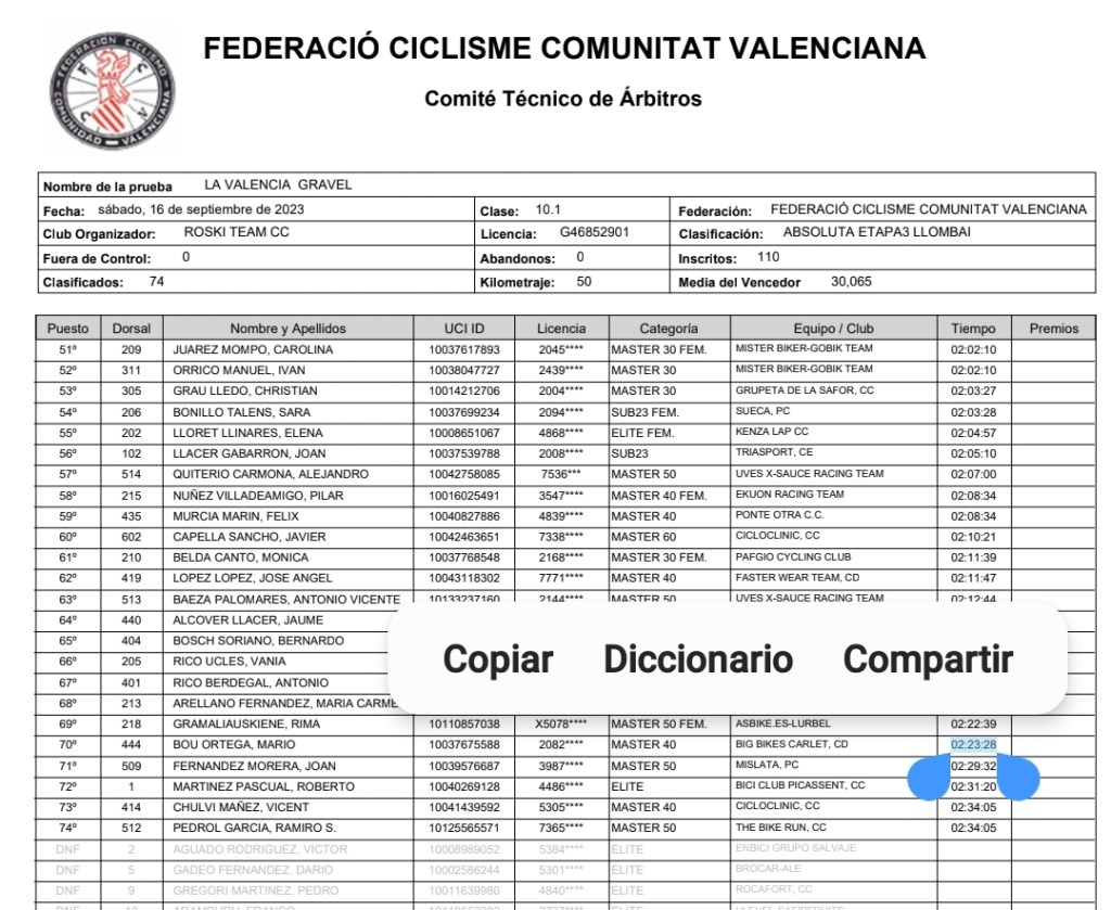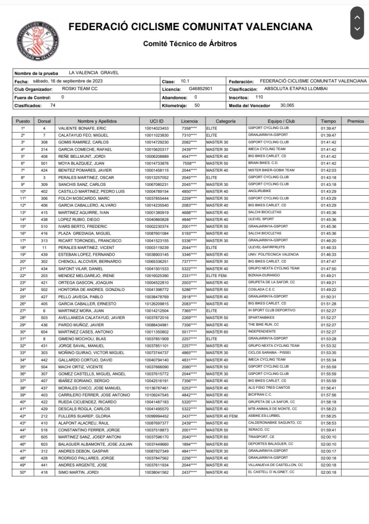 En la última etapa, disputada en Llombai, el triunfo fue para Eric Valiente, por delante de Miguel Calatayud y Carlos Gomis. En Féminas, Irene Méndez fue la vencedora. Valiente y Méndez han sido los primeros en la categoría élite; Carlos Gomis y Carolina Juárez (Mister Biker), en M30; Jordi Reñé (Big Biles) y Gloria Fullers (Asbike), en M40; Juan Moya (Brain Bikes), en M50; Antonio Martínez, en M60; y Joan Llacer (Triasport) y Sara Bonillo (Sueca), en Sub 23.