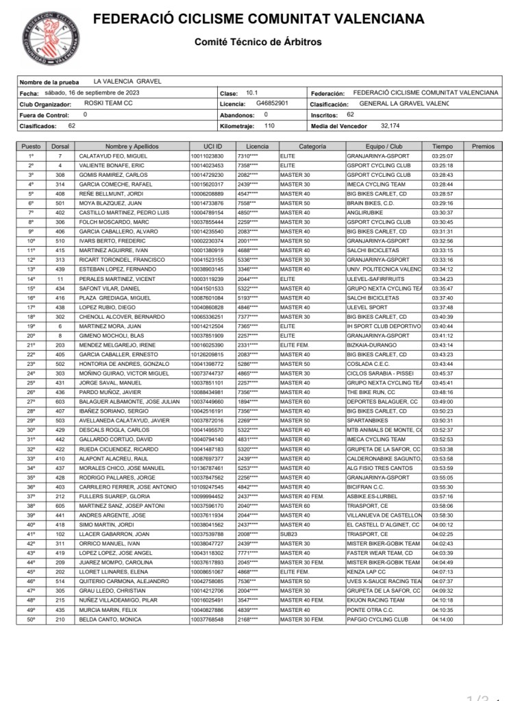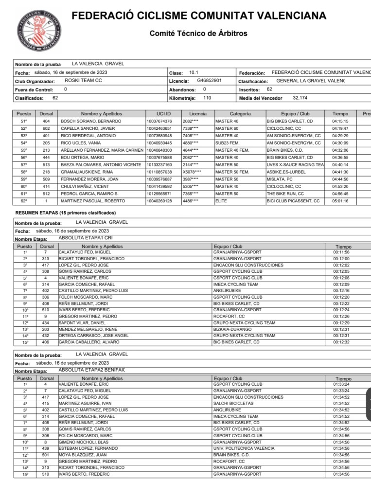 Miguel Calatayud (Granja Rinya) e Irene Méndez (Bizkaia Durango) han sido los ganadores de La Valencia Gravel tras la disputa de la tercera y última etapa en Llombai. Eric Valiente (Gsport) ha terminado segundo y Carlos Gomis (Gsport), tercero. Pedro José López (Encacon), que estaba en el podio tras las pruebas del sábado, no disputó la carrera del domingo. Calatayud y Méndez han sido los primeros en la categoría élite; Carlos Gomis y Carolina Juárez (Mister Biker), en M30; Jordi Reñé (Big Biles) y Gloria Fullers (Asbike), en M40; Juan Moya (Brain Bikes), en M50; José Julián Balaguer (Deportes Balaguer), en M60; y Joan Llacer (Triasport) y Vania Rico (AM Sonido), en Sub 23.