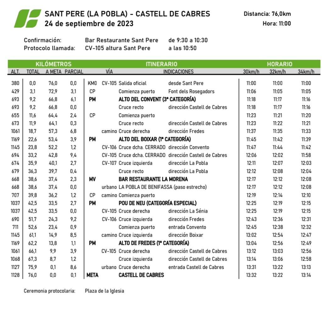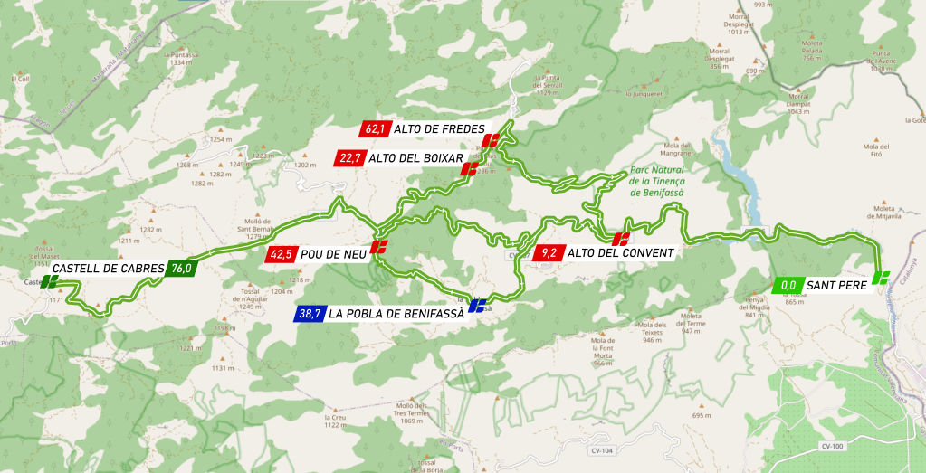 Los corredores deberán afrontar un duro recorrido por las carreteras del paraje natural de 76 kilómetros y 2.000 metros de desnivel positivos. La salida tendrá lugar desde la Font de Sant Pere del Ballestar a las 11 de la mañana. Deberán ascender en primer lugar el Alto del Convent (km 9,2) de tercera categoría, seguido del Alto del Boixar (km 22,6), de primera categoría, seleccionando el grupo principal. Una rápida bajada desde Fredes hasta la Pobla de Benifassà, donde se disputará la única meta volante de la jornada (km 38,6) y dará comienzo a la subida más temible, Pou de Neu (km 42,5), de primera categoría, con 2,7km a una media del 12,4%, una verdadera pared inédita para el ciclismo de competición.