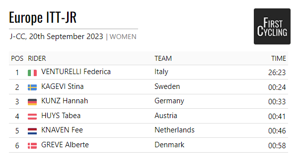 La categoría júnior ha dejado una gran alegría para la Selección Española gracias a la gran actuación de Markel Beloki, el campeón nacional, que en un recorrido completamente plano ha sacado lo mejor de sí para meterse de lleno entre los mejores especialistas de la categoría. Beloki, con un tiempo de 23’59”, ha finalizado en 7ª posición, a algo más de un minuto del ganador, que ha sido el danés Philipsen, que al igual que hizo en la línea del Mundial se ha exhibido para hacerse con la victoria.