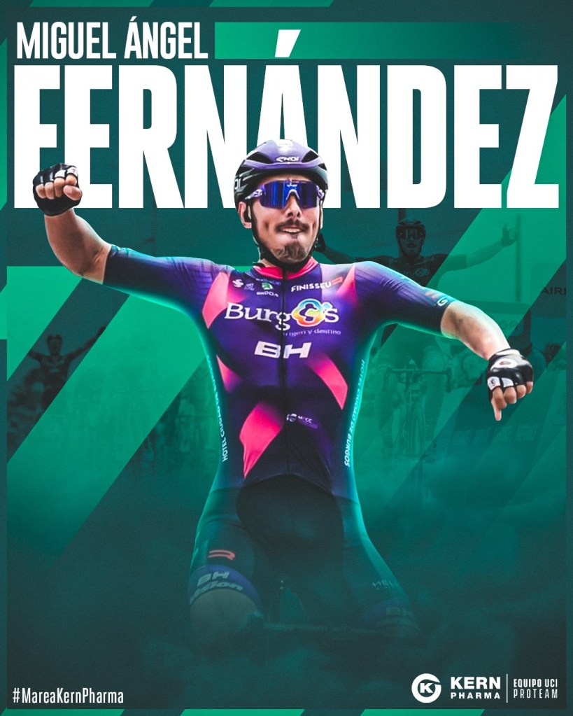Por su parte, Juanjo Oroz, manager general del Equipo Kern Pharma, celebra el acuerdo: “Conocemos a Miguel Ángel Fernández desde joven y fue su punta de velocidad lo que nos atrajo. Es un ciclista rápido al que nos gustaría darle continuidad en el calendario para que pueda sacar todo su potencial. En el equipo trataremos de confeccionar un calendario que se le adapte para que destaque en las llegadas masivas, pues era un aspecto que debíamos reforzar. Además, sus ganas de venir y de sumar han hecho que el contacto y la primera impresión sea buena”.