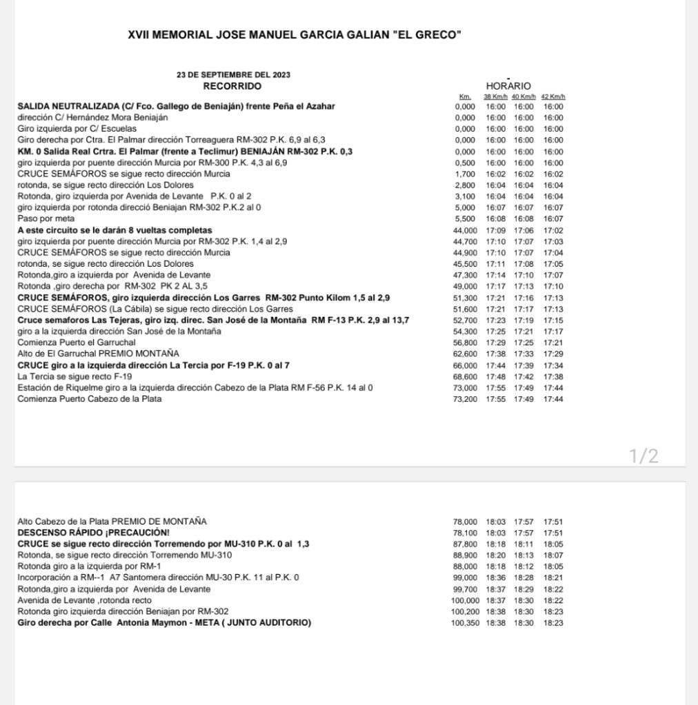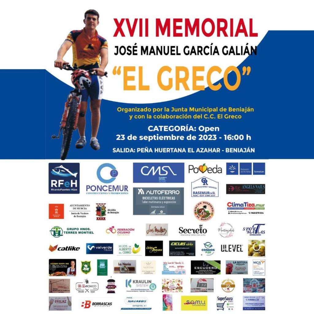 El sábado, día 23 de septiembre, se disputa en Beniaján el XVII Memorial José Manuel García Galián «El Greco», categoría Open, prueba puntuable para la Copa de Otoño de la Región de Murcia 2023. La salida se dará a las 16 horas y el pelotón deberá recorrer 100.35 kilómetros.