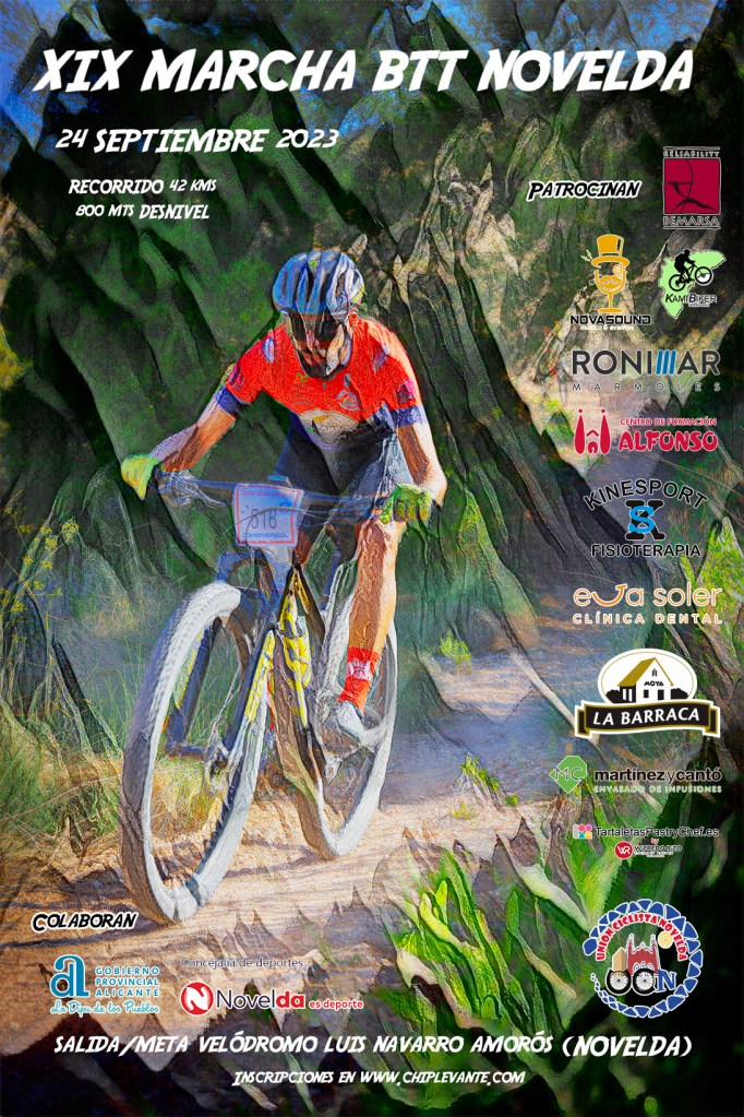 La XIX Marcha BTT Novelda se celebrará el domingo, 24 de septiembre, a las 10.00h con 259 inscritos. Tendrá un recorrido de 40 kilómetros y un desnivel acumulado de unos 900 metros. Este año habrá además un tramo cronometrado durante el recorrido de 1,2 kms donde los más rápidos podrán medir sus fuerzas con el resto de participantes y optar a un premio especial.
