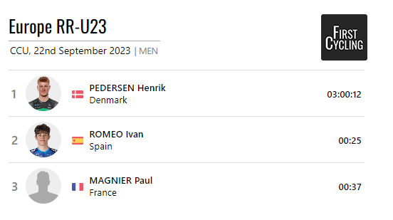 El vallisoletano Iván Romeo redondea un Campeonato de Europa de ensueño, tras ser 4° en la CRI, con una actuación estelar desde la fuga para hacerse con la plata en la prueba de ruta. Solo Henrik Pedersen (Dinamarca) pudo superarle. Paul Magnier (Francia) ha completdo el podio. Em la cima del Col du VAM, el danés sucede al último en conseguir el triunfo en un Europeo, el alemán Felix Engelhardt , el año pasado en Portugal.