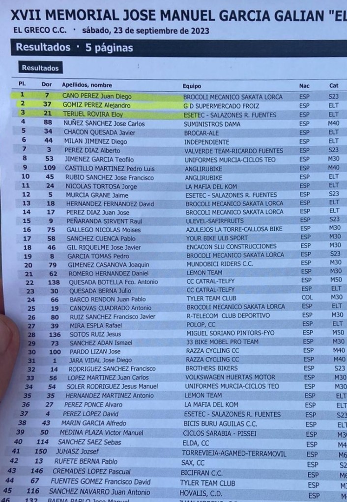 Juan Diego Cano (Brócoli) se ha impuesto en solitario en Beniaján en el XVII Memorial José Manuel García Galián «El Greco», categoría Open, prueba puntuable para la Copa de Otoño de la Región de Murcia 2023. El tiempo del ganador, tras 100.35 kilómetros de recorrido, ha sido de 2 horas, 19 minutos y ocho segundos. Atacó en El Cabezo de La Plata y sus perseguidores, Alejandro Gómiz, Eloy Teruel, José Carlos Núñez, Javier Chacón y Diego Milán no pudieron con él. Al final, Alejandro Gómiz (Froiz) y Eloy Teruel (Esetec Salazones Ricardo Fuentes) completaron el podio.