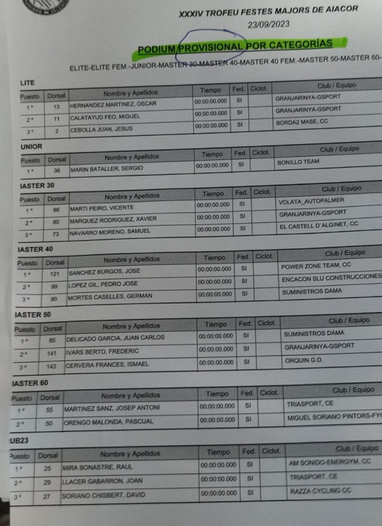 Hernández se ha impuesto en la categoría élite; Raúl Mira (AM Sonido), en Sub 23; Sergio Marín (Bonillo), en júniors; Vicente Martí (Volata), en M30; José Sánchez (Power), en M40; Juan Carlos Delicado (Suministros Dama), en M50; y Josep Antonio Martínez (Triasport), en M60. Gloria Fullers ha vencido en féminas.
