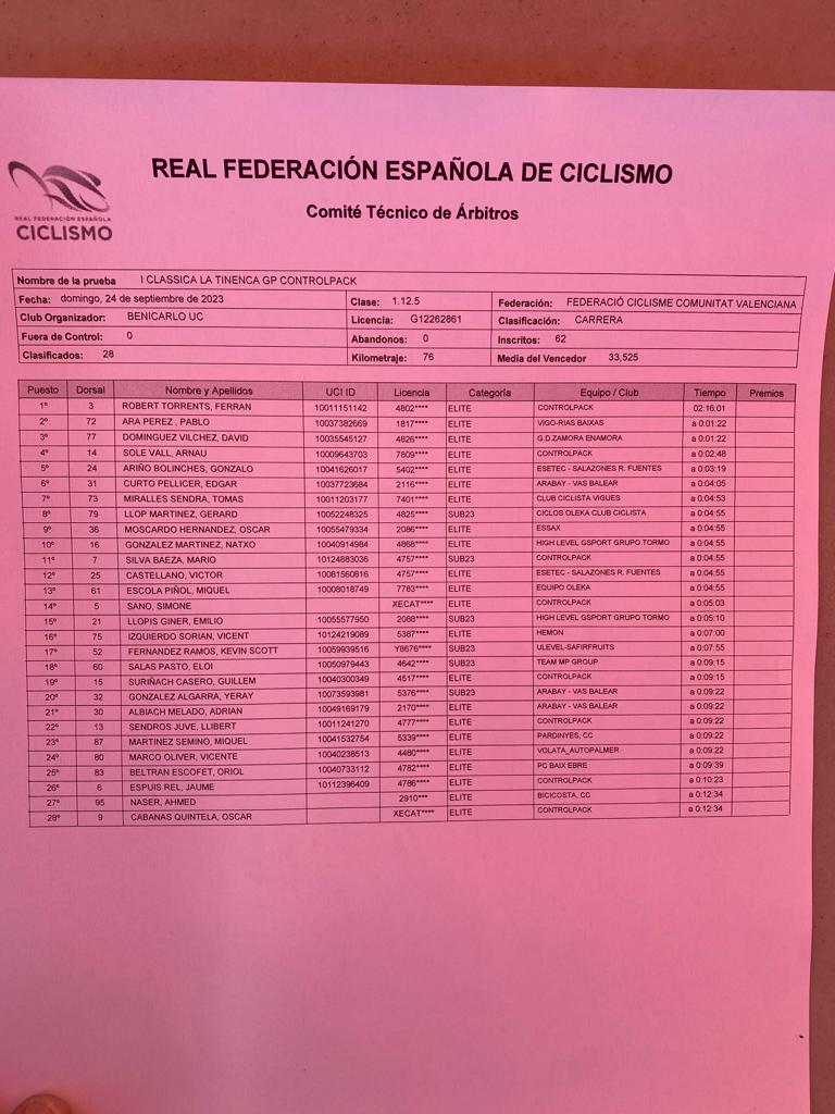 Tras la jornada de hoy, Gonzalo Ariño (Esetec Salazones Ricardo Fuentes) se ha impuesto en Challenge de la CV de la categoría élite; Lucan Serban (High Level-Gsport), en sub 23; Domingos Werik (Valverde Team), la clasificación de las Metas Volantes;y, Adrián Albiach, la de la Montaña.