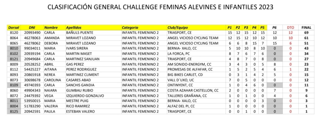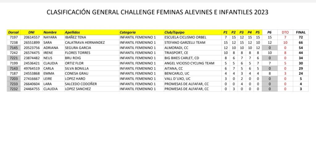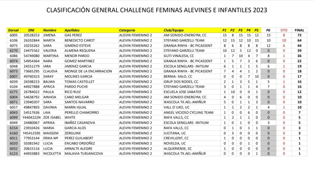 Vilafranca ha coronado hoy como ganadoras de la Challenge Interprovincial de Féminas a Valeria Coloma (AM Sonido), en Alevines 1; Jimena Gas (AM Sonido), en Alevines 2; Nayara Ibáñez (Orbel), en Infantiles 1; Carla Bañuls (Triasport), en Infantiles 2; además de Carla Gómez (Almoradí) y Sara Calatrava, en Gynkhana Alevín e Infantil, respectivamente.