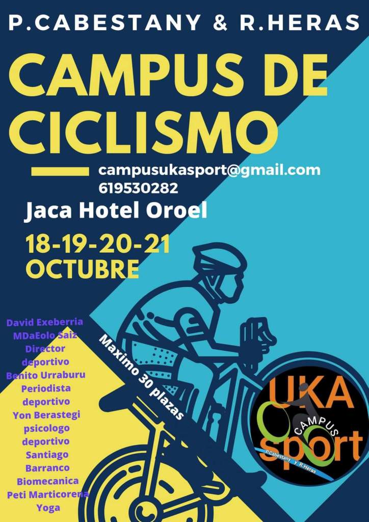 Los días 18 a 21 de octubre se celebra en el hotel Oroel de Jaca (Huesca) el Campus de Ciclismo Ukasport que será dirigido por los excorredores Peio Ruiz Cabestany y Roberto Heras. Habrá salidas en bicicleta, charlas sobre biomecánica, sesiones de yoga impartidas por Pety Martikorena... y una charla coloquio en la que estarán presentes además de Ruiz Cabestany y Heras el periodista deportivo Benito Urraburu; Manolo Sainz, exdirector del equipo ciclista de la ONCE; Yon Berastegi, psicólogo alto rendimiento deportivo; y Santiago Barranco, de Prestbike Biomecánica ciclista.