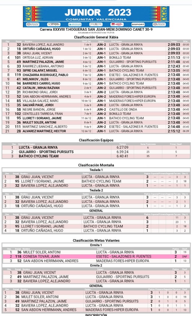 Exhibición del Lucta-Granja Rinya en el XXXIX Trofeo Hogueras de San Juan-VIII Memorial Domingo Canet disputado hoy en Jávea. Alejandro Baviera, Hugo Ortuño y Vicent Grau han entrado juntos en meta por este orden. De esta manera, Vicent Grau, que hoy ha ganado las Metas Volantes y la Montaña, se ha impuesto en la Challenge Júnior de Ruta de la FCCV-Itegra. Por escuadras se ha impuesto el Lucta.