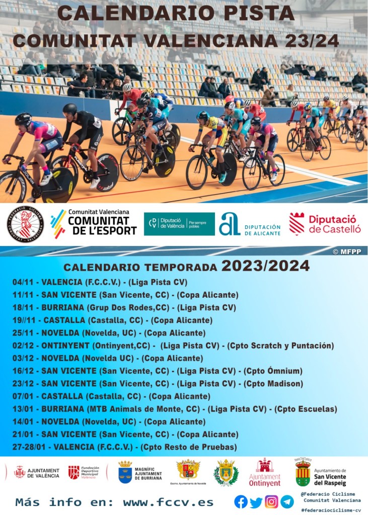 La temporada de pista 2023-2024 de la Comunidad Valenciana dará comienzo en el mes de noviembre. El Velódromo Luis Puig de València acogerá la prueba inaugural de esta temporada el sábado 4 de noviembre y estará organizada por la FCCV. A esta le seguirán seis pruebas más repartidas entre Burriana (2), Ontinyent y San Vicent del Raspeig (2). Un recorrido por los velódromos de la Comunitat para celebrar el Campeonato de scratch y puntuación, Campeonato Omnium, Campeonato Madison y el Campeonato de Escuelas. València pondrá el cierre a la temporada 2023/2024.Las inscripciones para la primera prueba estarán abiertas desde mañana día 3 de octubre a las 10:00 horas.