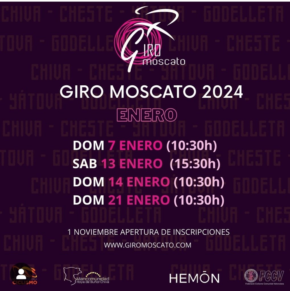 La organización del Giro Moscato ha decidido que la tercera edición de su prueba se dispute en el mes de enero, los días 7, 13, 14 y 21. A falta de confirmar las localidades que alberguen las estapas las incripciones se abrirán el próximo 1 de noviembre. Miguel Calatayud (Granja Rinya) fue el ganador de la última edición. Estuvo acompañado en el podio final por Fernando Esteban y David Serrano. Calatayud también conquistó el premio de las metas volantes y Álvaro Marzá, la montaña.