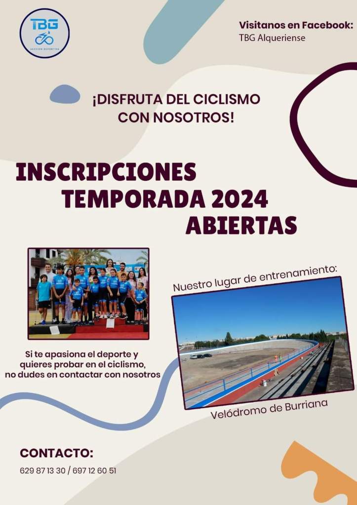 La Escuela de Ciclismo TBG Alqueriense hace una llamada a todos los niños que desean practicar del deporte de pedal con su maillot. «Si te apasiona el deporte y quieres probar en el ciclismo no dudes en contactar con nosostros», afirma la entidad que entrena en el velódromo de Burriana y cuenta con un cuerpo técnico con un gran nivel y con muchos años de experiencia. Las incripciones están abiertas y los interesados pueden llamar a los números de teléfono 629 87 13 30/ 697 12 60 51