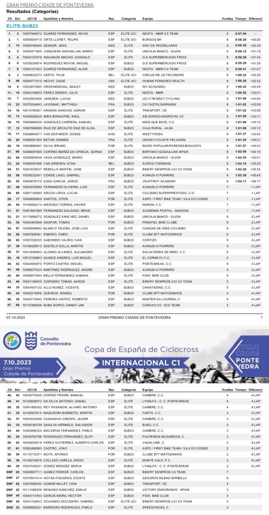 Kevin Suárez se lleva la victoria tras una brillante remontada en el CX de Pontevedra. Felipe Orts ha ocupado la segunda posición y el neerlandés Jens Dekker ha sido tercera. Miguel Rodríguez, sexto, mejor sub23. Puesto 13, sexto sub 23, Raúl Mira.