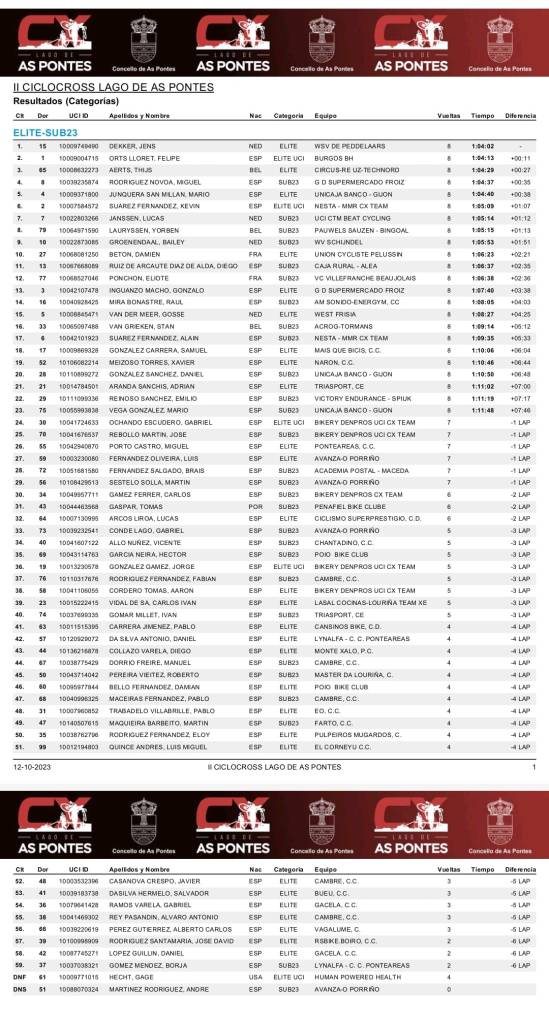 El neerlandés Jens Dekker (WSV) y Laura Verdonschot (De Ceuster) han logrado hoy la victoria en el Ciclocross Lago de As Pontes. Felipe Orts (Burgos – BH) y Sofía Rodríguez (Nesta-NMR) han conseguido la segunda plaza. El tercer cajón del podio lo ocupó el belga Thijs Aerts, en la categoría masculina, mientras que Miguel Rodríguez, cuarto, se hizo con la victoria sub-23 aupándose al liderato. Raúl Mira (AM Sonido) ha terminado en el puesto 14 (séptimo sub 23), Adrián Aranda (Triasport), en el 21, e Iván Gomar (Triasport), en el 40. En categoría élite se mantiene Kevin Suárez como líder tras finalizar sexto.