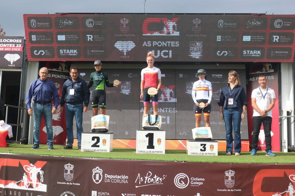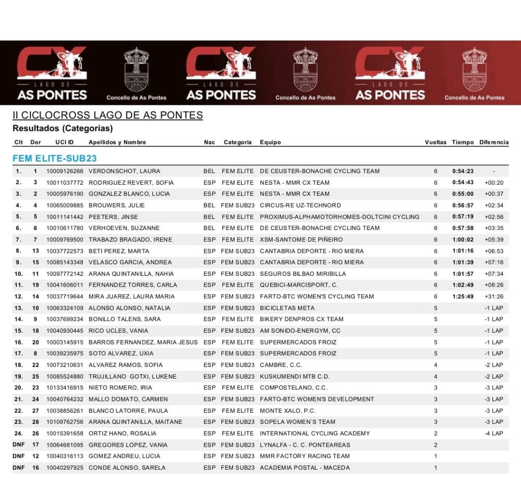 En la categoría élite/sub23 femenina, Laura Verdonschot ha seguido imponiendo su ley en el circuito nacional. Esta vez, la belga quiso romper la carrera desde un inicio, y no esperar a la última vuelta como en las pruebas anteriores. Lucía González y Sofía Rodríguez intentaron seguirla, buscando otra estrategia, pero el imponente ritmo de la líder de la Copa en las dos subidas y en el tramo de arena, dilapidaba las opciones de las corredoras del Nesta. Con Verdonschot ya imparable, la lucha se centraba entre las españolas por la segunda posición. A falta de dos vueltas, la corredora valenciana adelantaba a la campeona de España, pero su ritmo no fue suficiente para poder alcanzar a la belga. Verdonschot sumaba su tercera victoria consecutiva en la Copa de España, con Sofía Rodríguez a 20 segundos y Lucía González a 37”. La también belga Julie Browers, cuarta en el lago de As Pontes, se convierte en la nueva líder sub23.