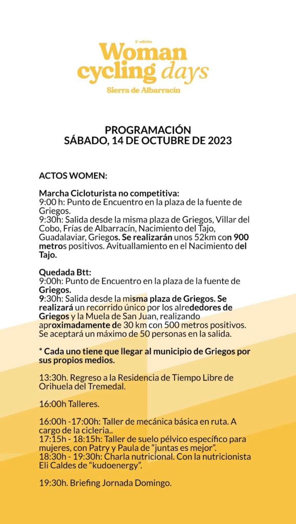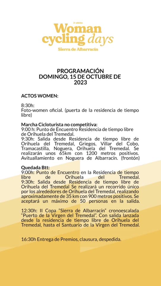 Una mesa redonda con la presencia de Mónica Guajardo, Marta Romeu, Alba Teruel, Dori Ruano, Clara Santamaría, Sandra Lorenzo y Ester Iniesta ha servido para dar el banderazo de salida a la Women Cycling Days que se va a celebrar durante todo el fin de semana en Orihuela del Tremedal. Se van a realizar varias charlas y mesas redondas con deportistas profesionales y expertas del ciclismo. Además, las participantes podrán hacer lo que más les gusta, ya que la segunda edición de la Women Cycling Days-Sierra de Albarracín también incluirá diversas salidas y «quedadas» en BTT y Carretera. También hay prevista una cronoescalada que comenzará el domingo, a las 12.30 horas, desde la residencia de tiempo libre de localidad turolense, hasta Santuario de la Virgen del Tremedal. Habrá talleres de mecánica, nutrición y entrenamiento. Y para los más pequeños, circuitos de habilidad y talleres en bici.