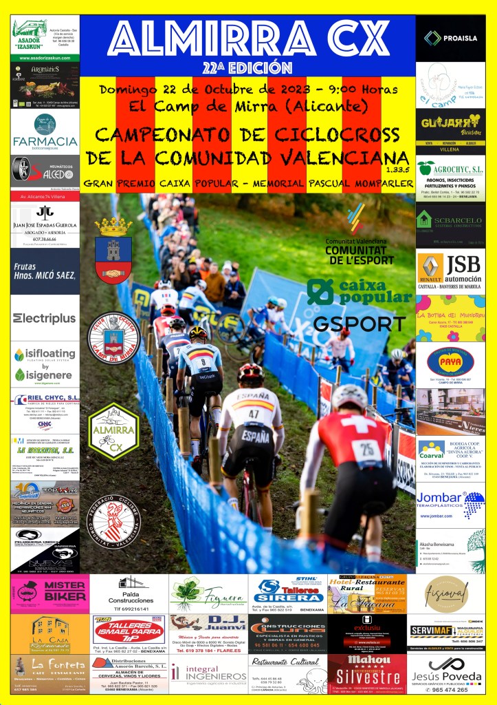 El Camp de Mirra vestirán el domingo, día 22 de octubre, a los nuevos campeones autonómicos de ciclocross. La competición comenzará a las 9 horas y los participantes tratarán de conseguir los maillots que durante el último año han llevado Adrián Aranda y Alba Teruel, en la categoría de élites; Raúl Mira y Susana Pérez, en sub 23; Óscar Orts y Leyre Almena, en cadetes; David Ivars y Claudia Pérez , en júniors; Carlos Sanchis y Carolina Juárez, en M30; Raúl Ballester y Sabrina Cerdá, en M40; Daniel Lorca y Roser Vidal, en M50; y José Julián Balaguer, en M60.