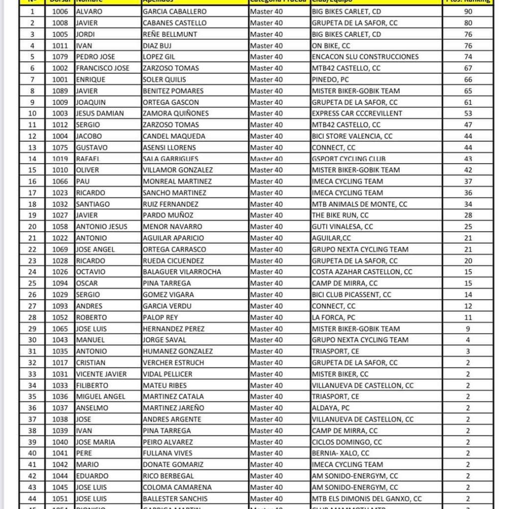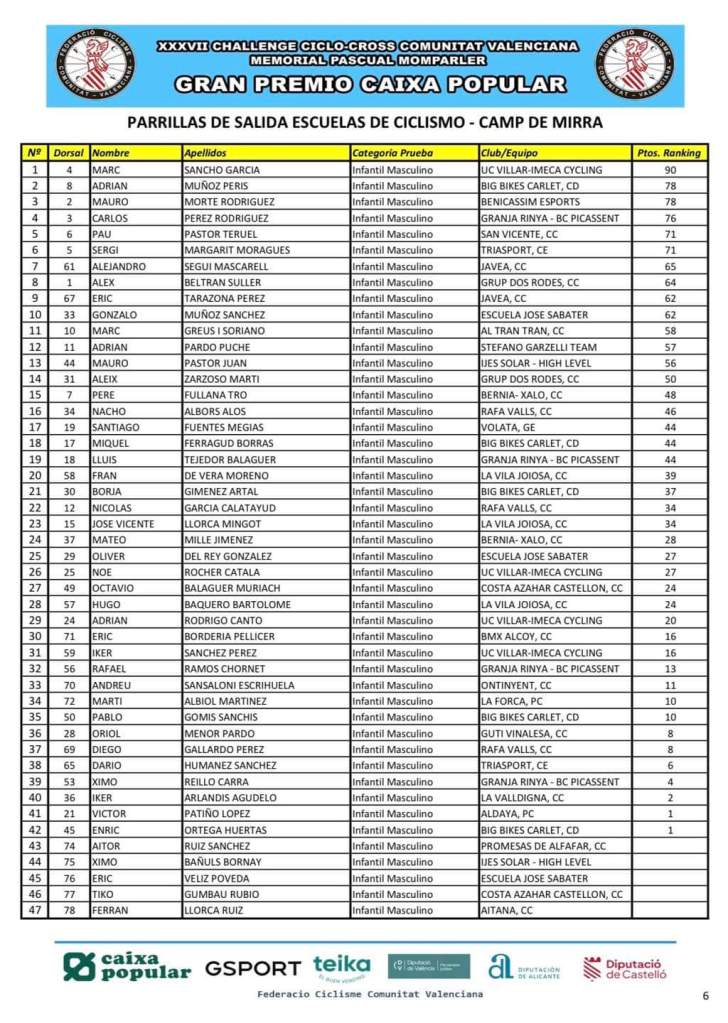 En la categoría de escuelas lograron el título en L’Enova: Gonzalo Muñoz (Sabater) y Jimena Gas (AM Sonido), en Alevines; Vicent Andrés (La Forca) y Carla Bañuls (Triasport), en Infantiles; Álex Moreno (UC Villar) y Vera Fullana (Bernia Xaló), en Principiantes; y Joan Francisco (Stefano Garzelli) y Martina Cano (AM Sonido), en Promesas.