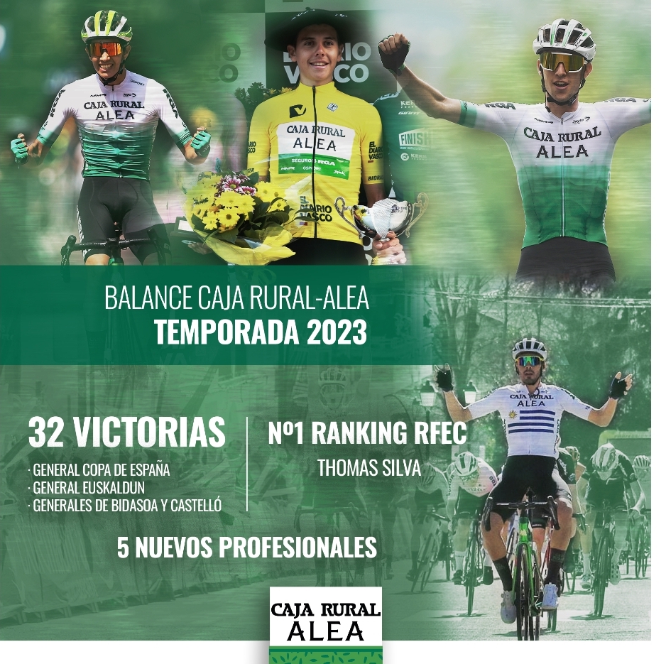 Finaliza un año deportivo más que provechoso para los intereses de Filial Caja Rural-Alea. Así lo prueban tanto los triunfos conseguidos a lo largo de la temporada (32) como sobre todo los ciclistas que iniciaron el curso en la plantilla sub 23 y que lo concluyen como nuevos profesionales. Y es que hasta cinco corredores han conseguido el salto de categoría, cuatro de ellos a Caja Rural-Seguros RGA, elevando así el número total de profesionales formados a lo largo de la historia del filial verde a 131.